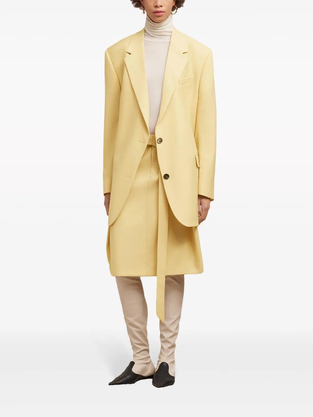 light yellow virgin wool notched lapels shoulder pads long sleeves buttoned cuffs front button fastening chest welt pocket two front flap pockets Italian rear vents straight hem