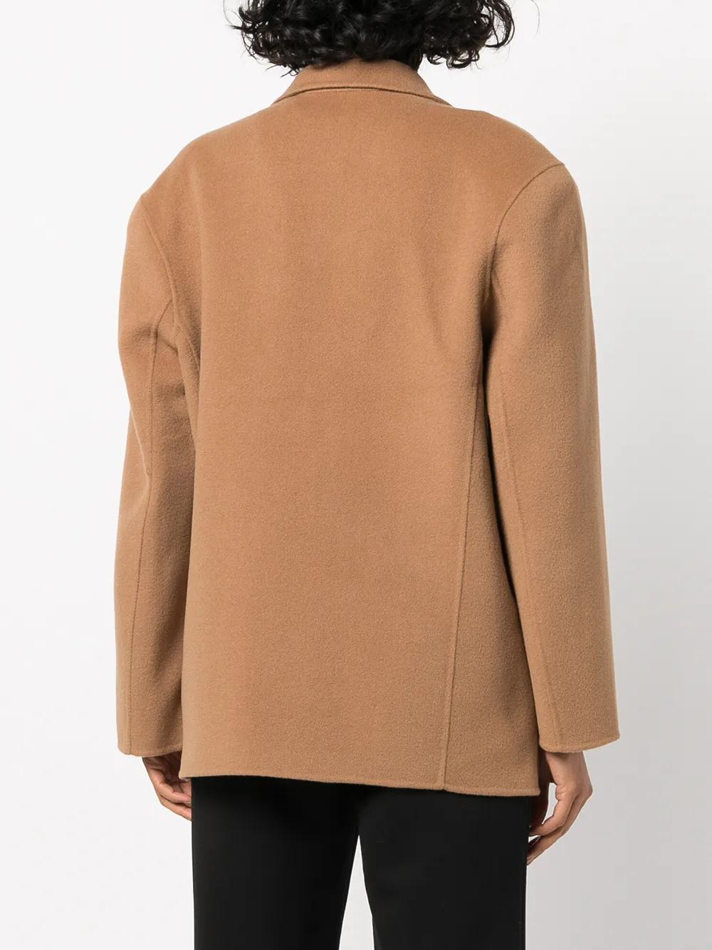 camel brown wool-cashmere blend notched lapels long sleeves front button fastening chest welt pocket two front flap pockets no lining