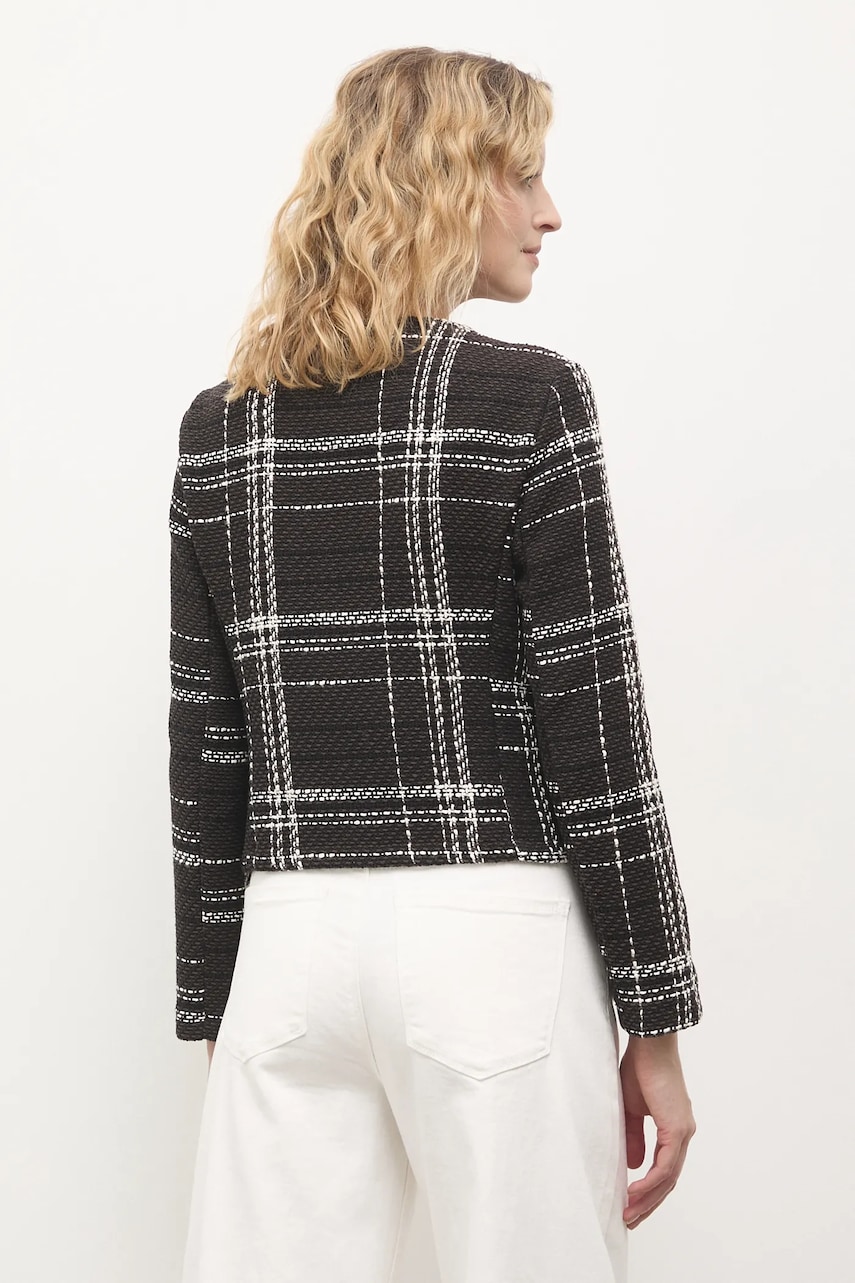 - Prosty, nie blokujący ruchów fason. - Jednorzędowe zapięcie na guziki. - Cienka, nieelastyczna tkanina. - Imitacja kieszeni z przodu. - Model bez podszewki. - Długość rękawa: 57 cm. - Długość: 50 cm. - Szerokość pod pachami: 47 cm. - Szerokość w ramionach: 38 cm. - Wymiary podane dla rozmiaru: S.