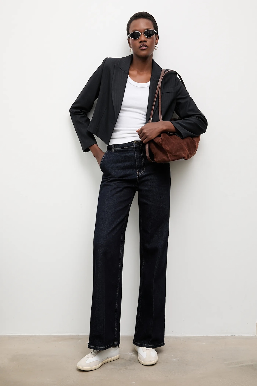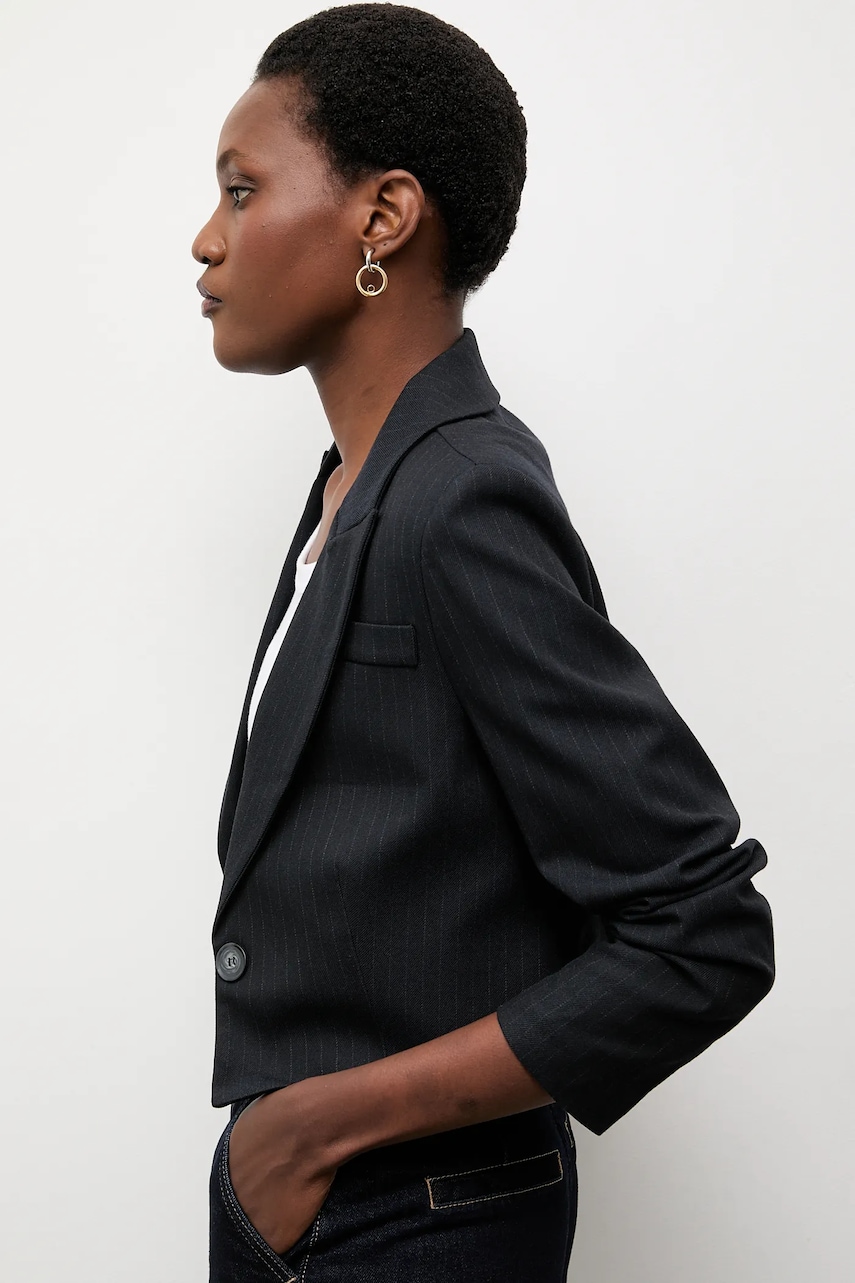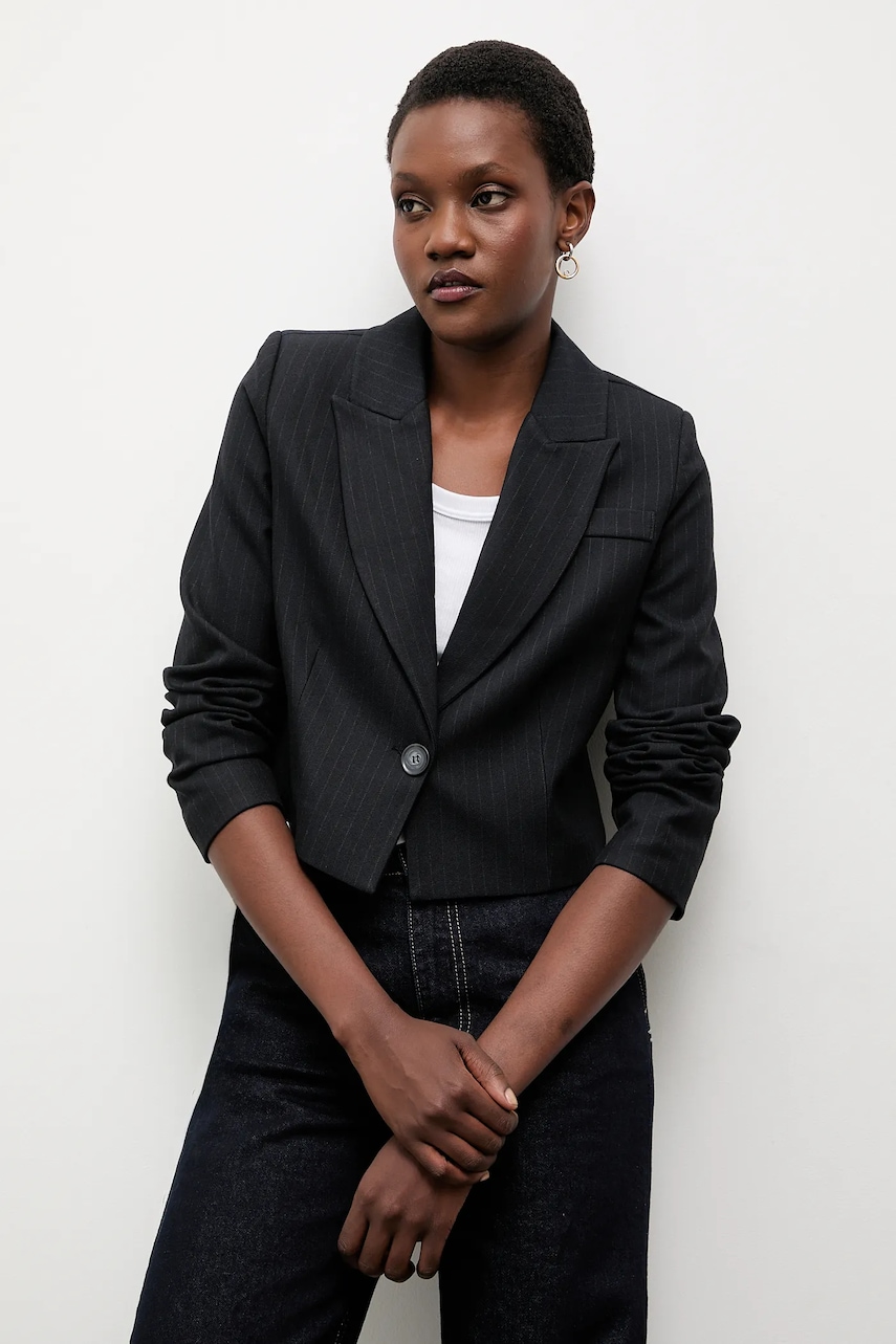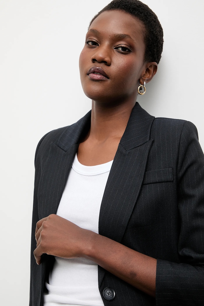 - Model na podszewce. - Zapięcie na guzik. - W ramiona wszyte poduszki. - Imitacja kieszeni na piersi. - Długość rękawa: 58 cm. - Długość: 45 cm. - Szerokość pod pachami: 47 cm. - Szerokość w ramionach: 35 cm. - Wymiary podane dla rozmiaru: S.