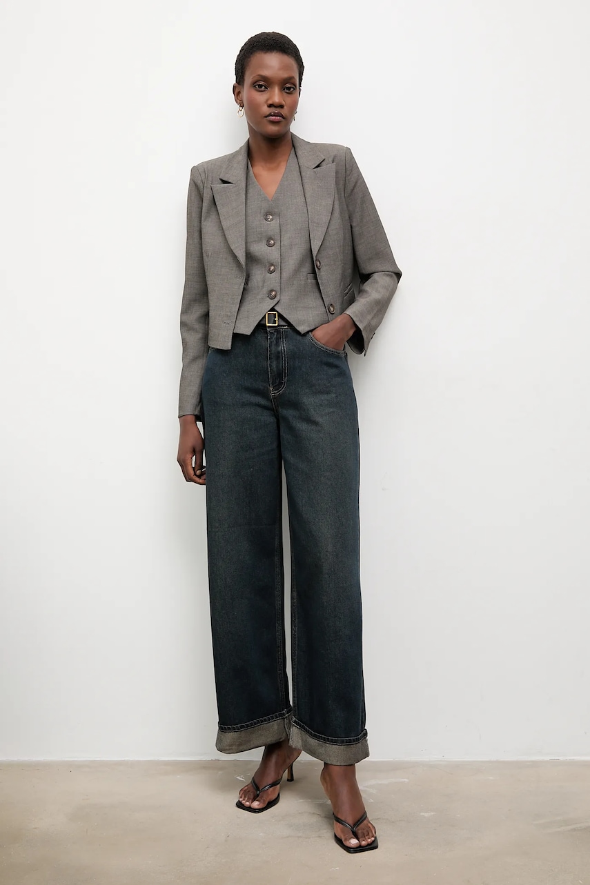 - Prosty, nie blokujący ruchów fason. - Model na podszewce. - Jednorzędowe zapięcie na guziki. - Klasyczne klapy. - W ramiona wszyte poduszki. - Imitacja kieszeni. - Cienka, nieelastyczna tkanina. - Długość rękawa: 61 cm. - Długość: 48 cm. - Szerokość pod pachami: 43 cm. - Szerokość w ramionach: 36 cm. - Wymiary podane dla rozmiaru: S.