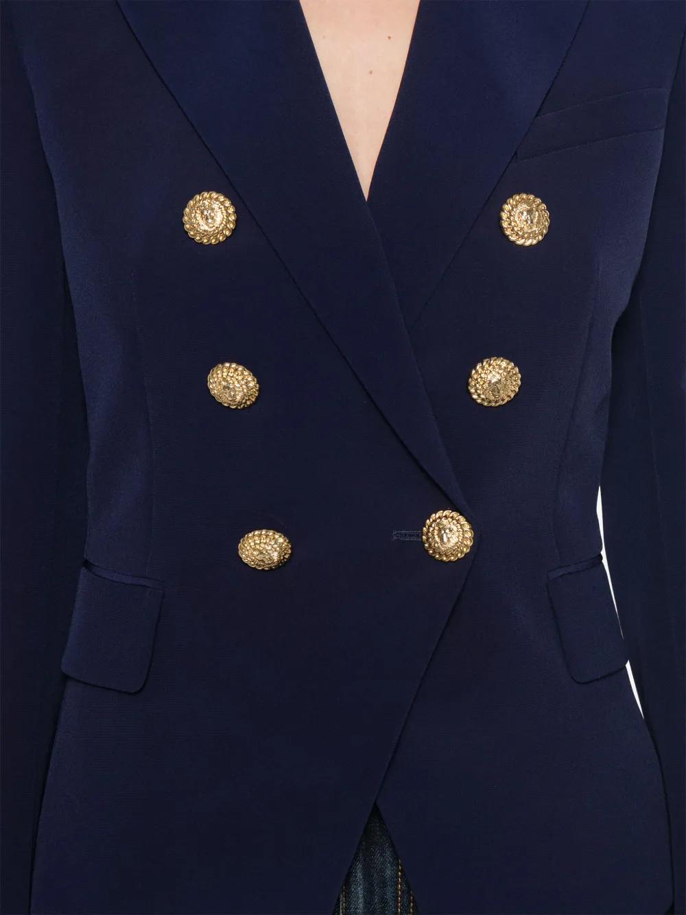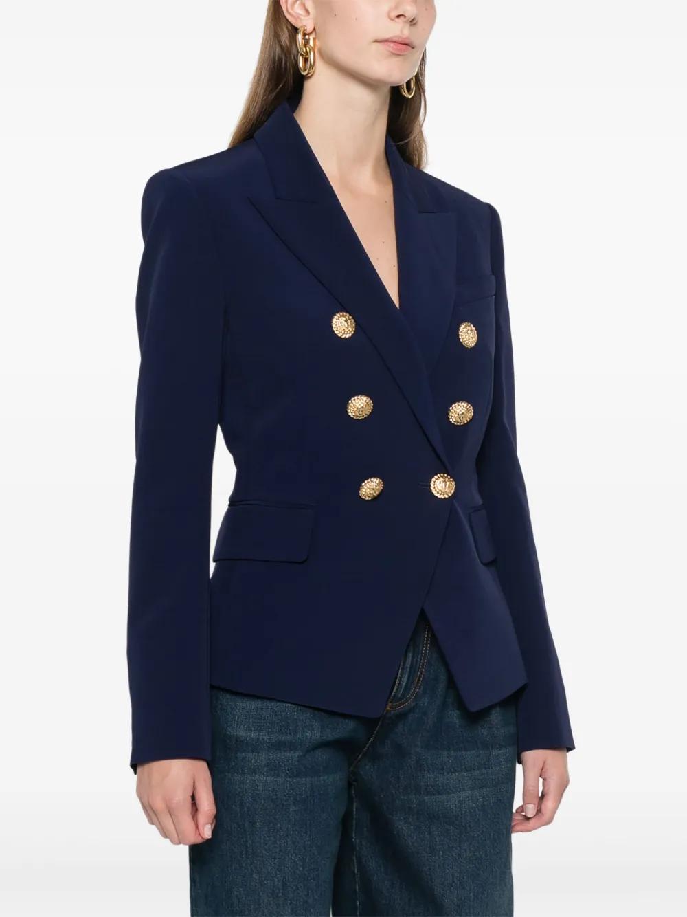imperial blue crepe texture double-breasted button fastening peak lapels chest welt pocket shoulder pads long sleeves buttoned cuffs two side flap pockets full lining straight hem