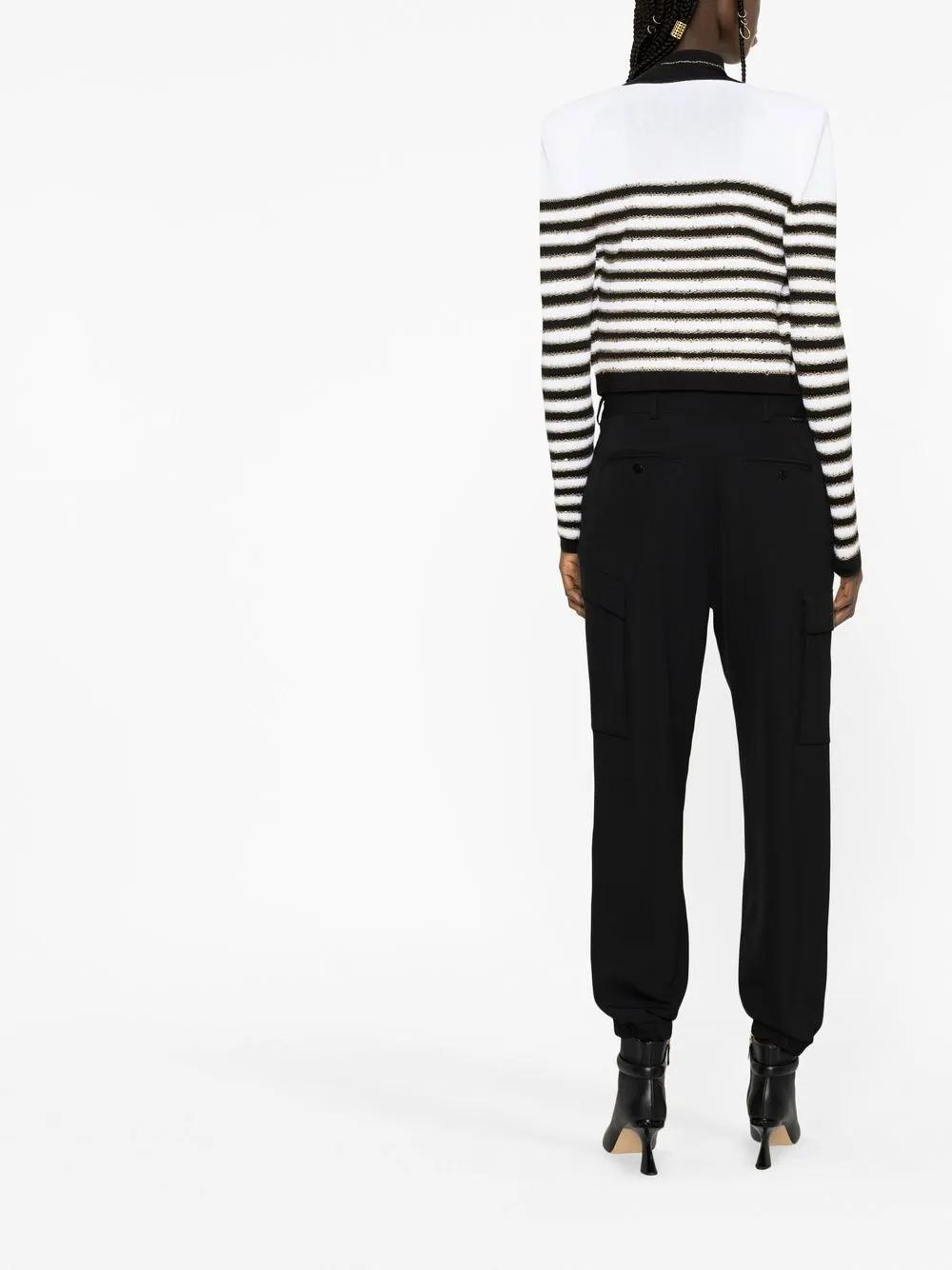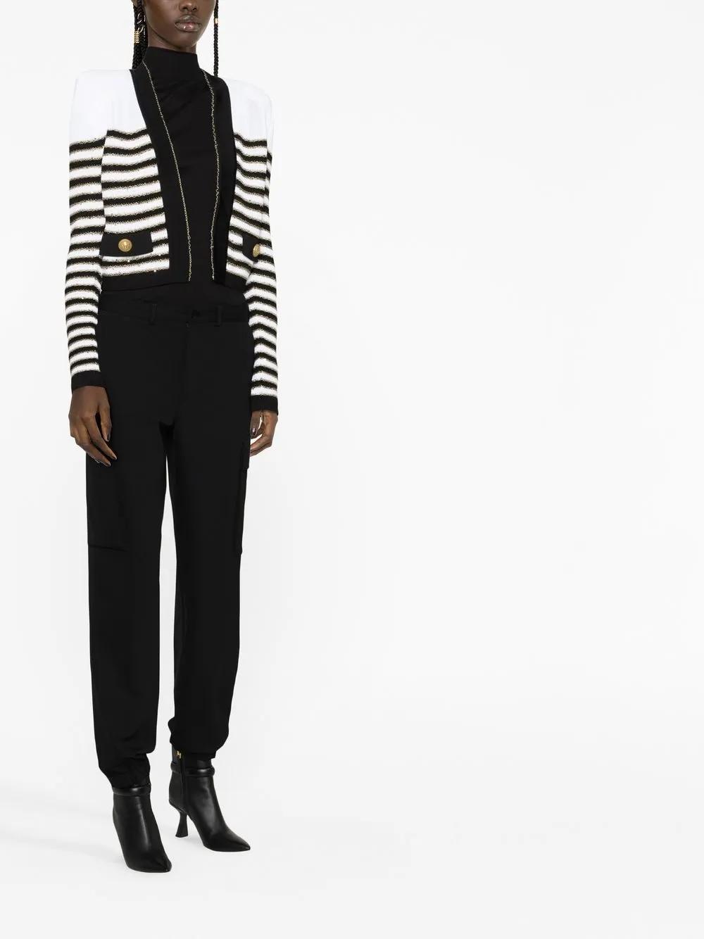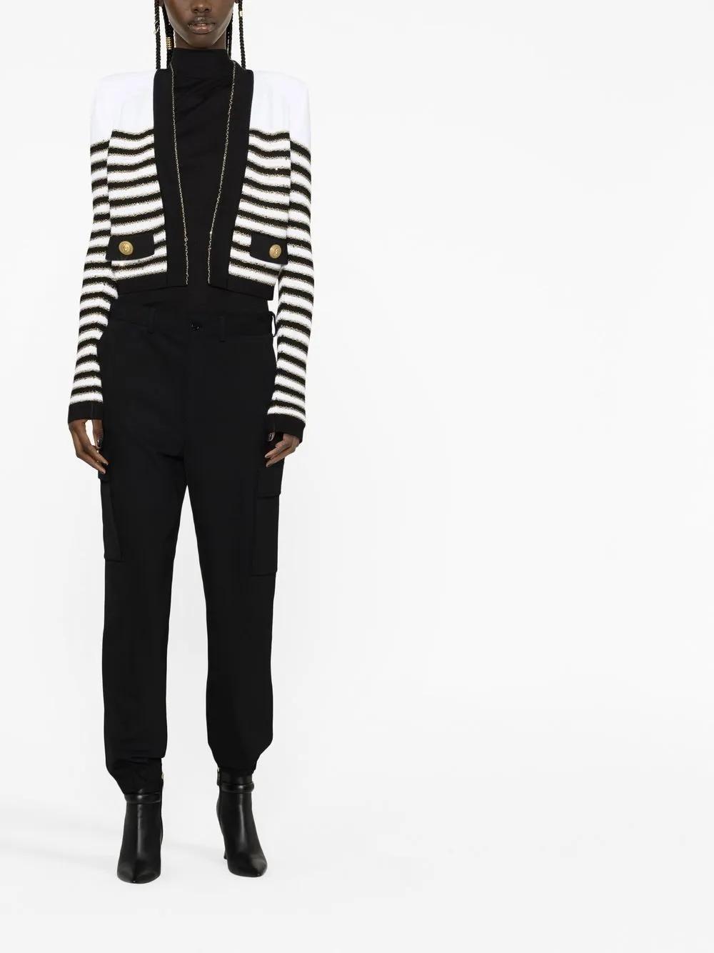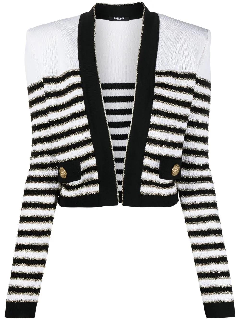 black/white metallic threading horizontal stripe pattern shoulder pads long sleeves open front decorative button detailing cropped