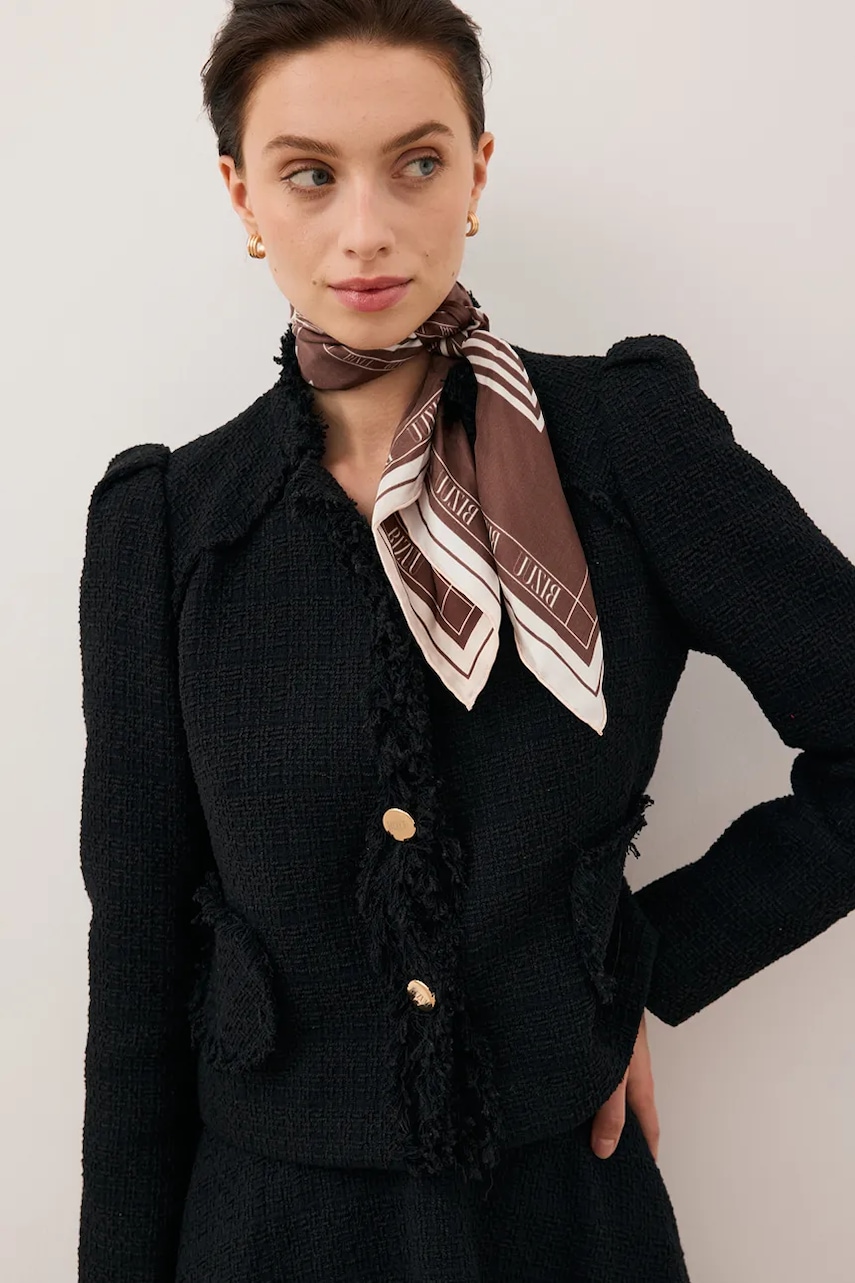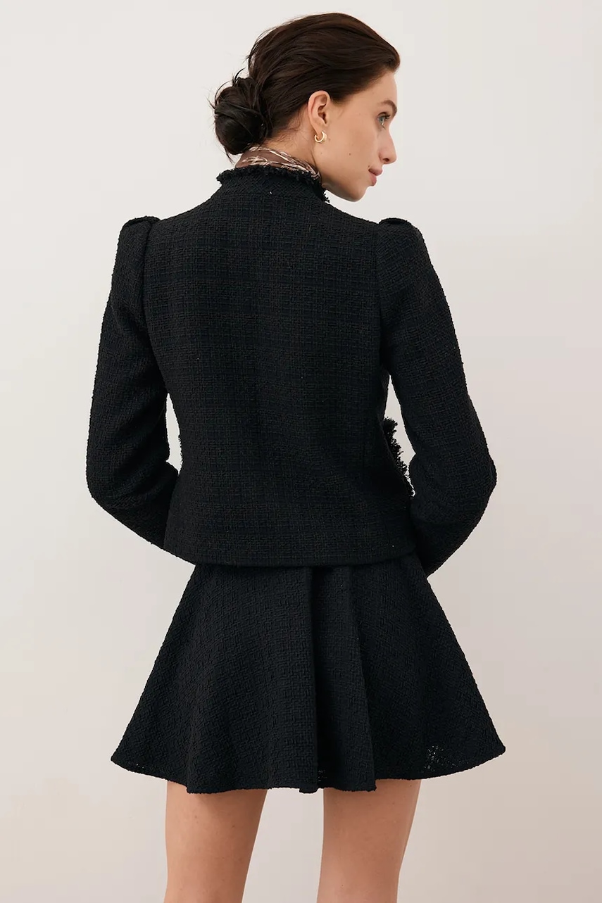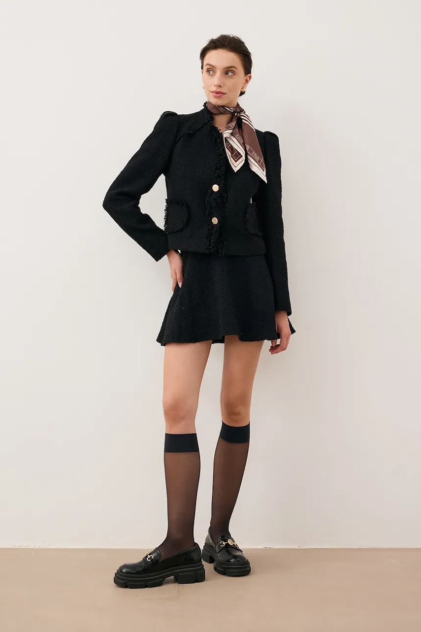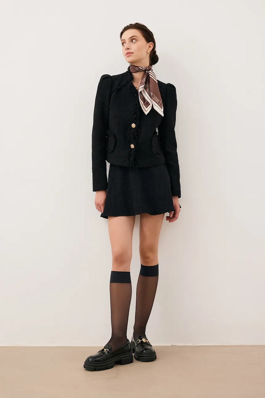 - Dopasowany, podkreślający sylwetkę fason. - Dodatkowa warstwa materiału w postaci podszewki. - Model z miękkim kołnierzykiem. - Długie, bufiaste rękawy. - Wygodne zapięcie na guziki ułatwia zakładanie i zdejmowanie. - Model z ozdobnymi wystrzępieniami.