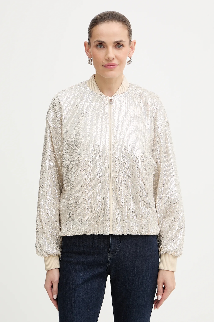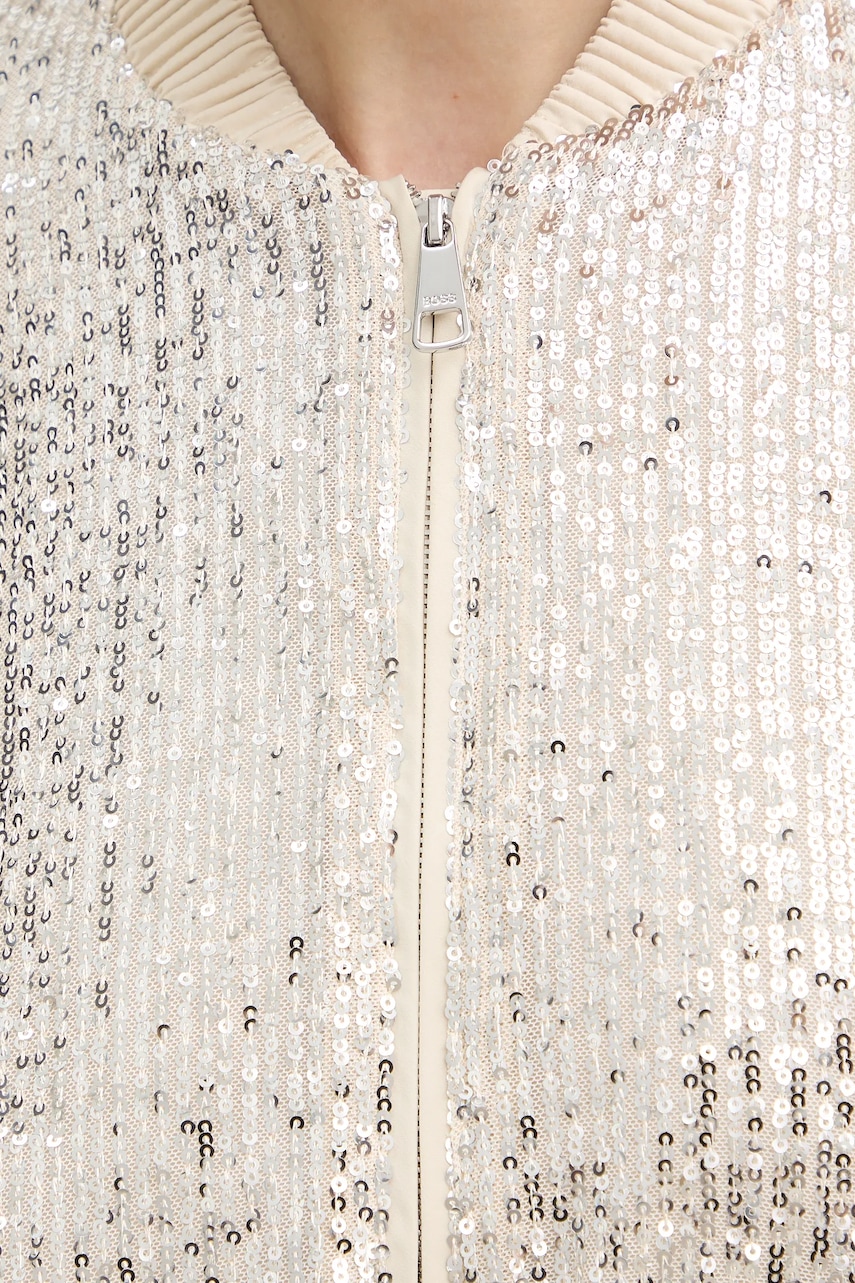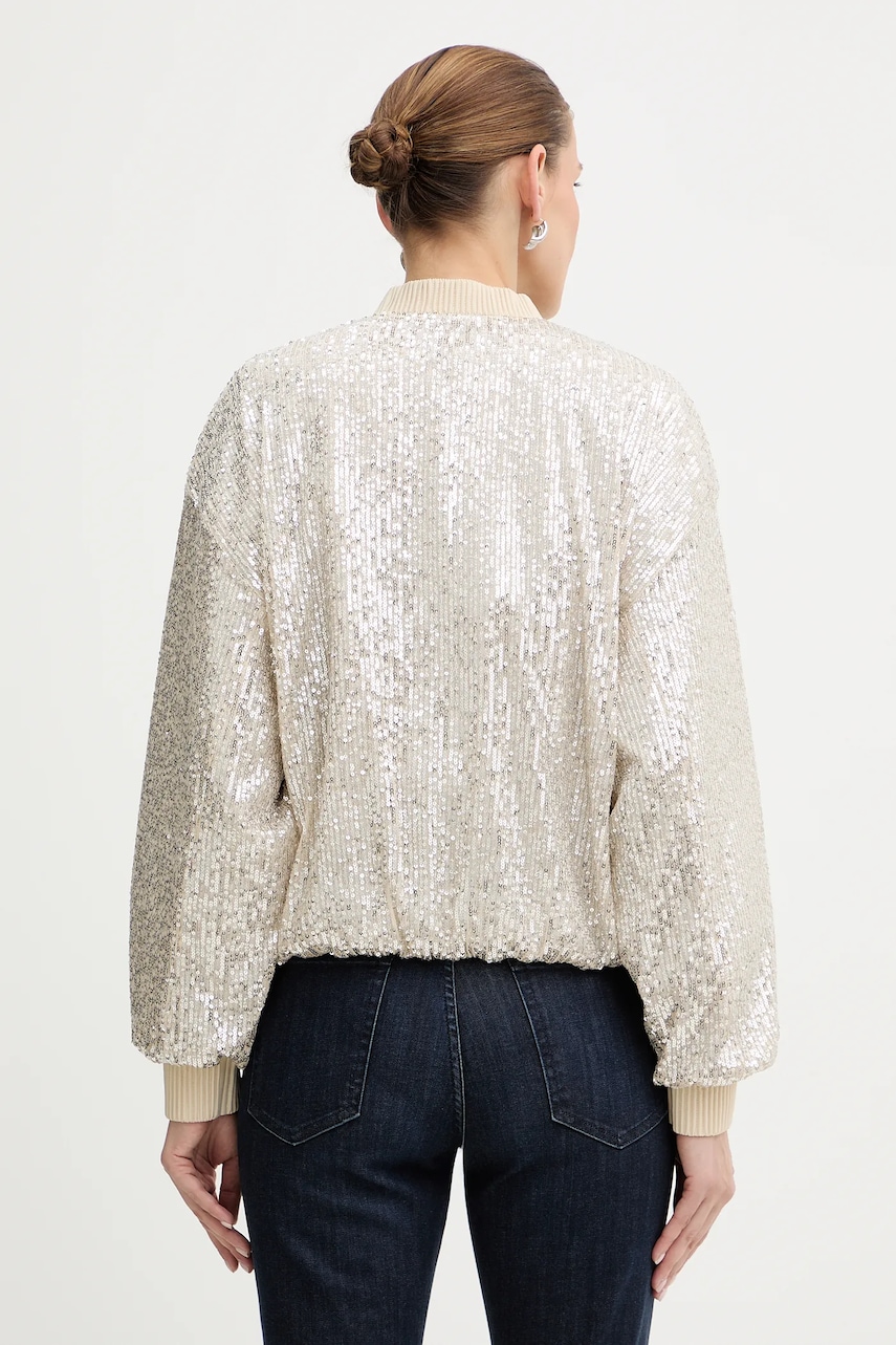 - Prosty fason. - Zapięcie na suwak. - Model z materiału z cekinami. - Model na podszewce. - Obniżona linia ramion. - Dwie wsuwane kieszenie boczne. - Rękawy wykończone wygodnym, elastycznym ściągaczem. - Długość rękawa: 72 cm. - Długość: 57 cm. - Szerokość pod pachami: 53 cm. - Wymiary podane dla rozmiaru: 36.