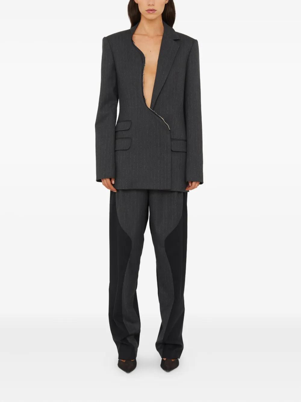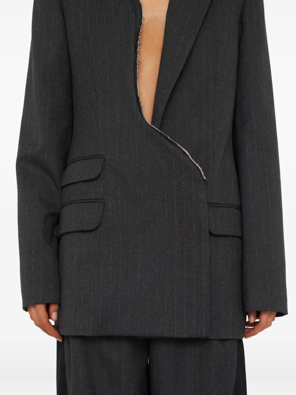 charcoal grey pinstripe pattern asymmetrical zip fastening flap pockets asymmetric lapels frayed edges