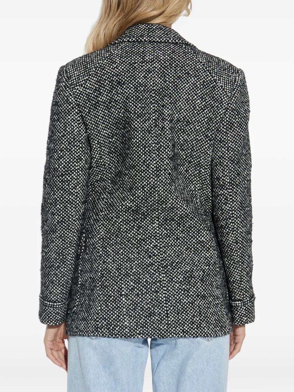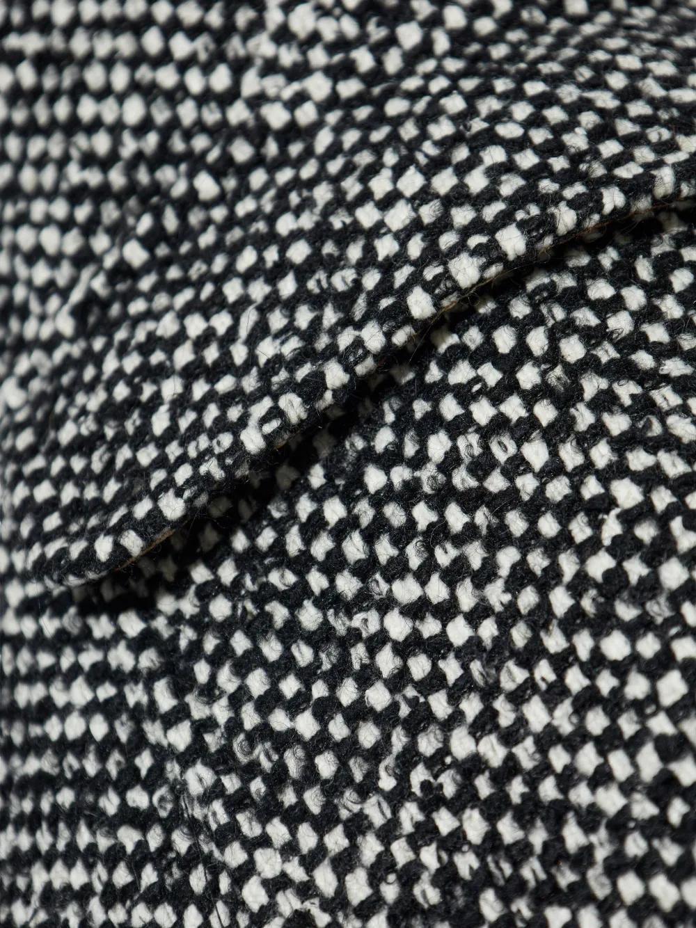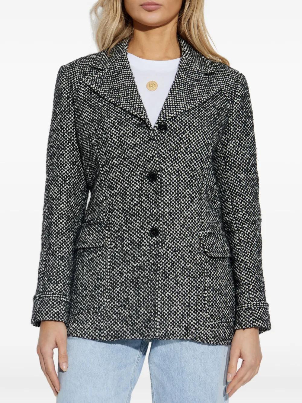 black and white tweed texture notched lapels three button fastening flap pockets straight hem