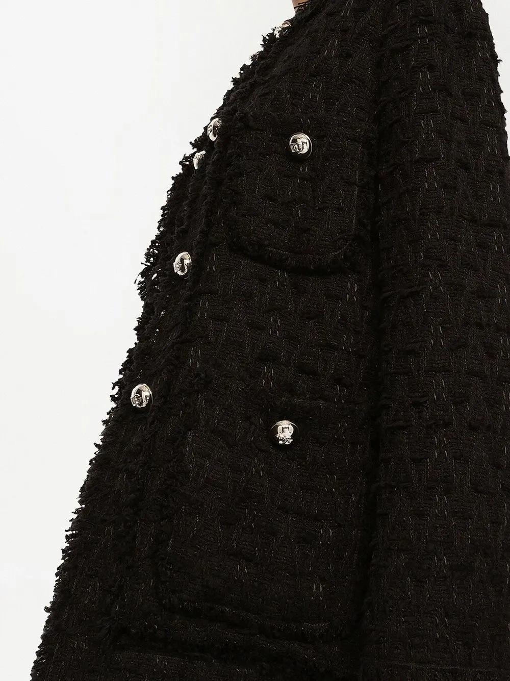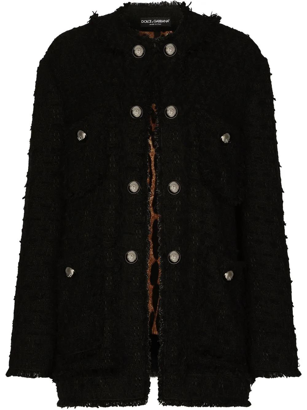 tweed double-breasted jacket from DOLCE & GABBANA featuring black, cotton blend, tweed, collarless, double-breasted button fastening, two chest patch pockets and two front patch pockets.