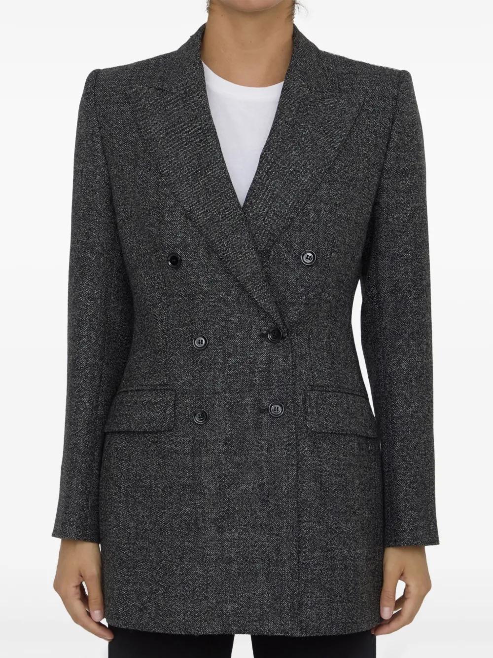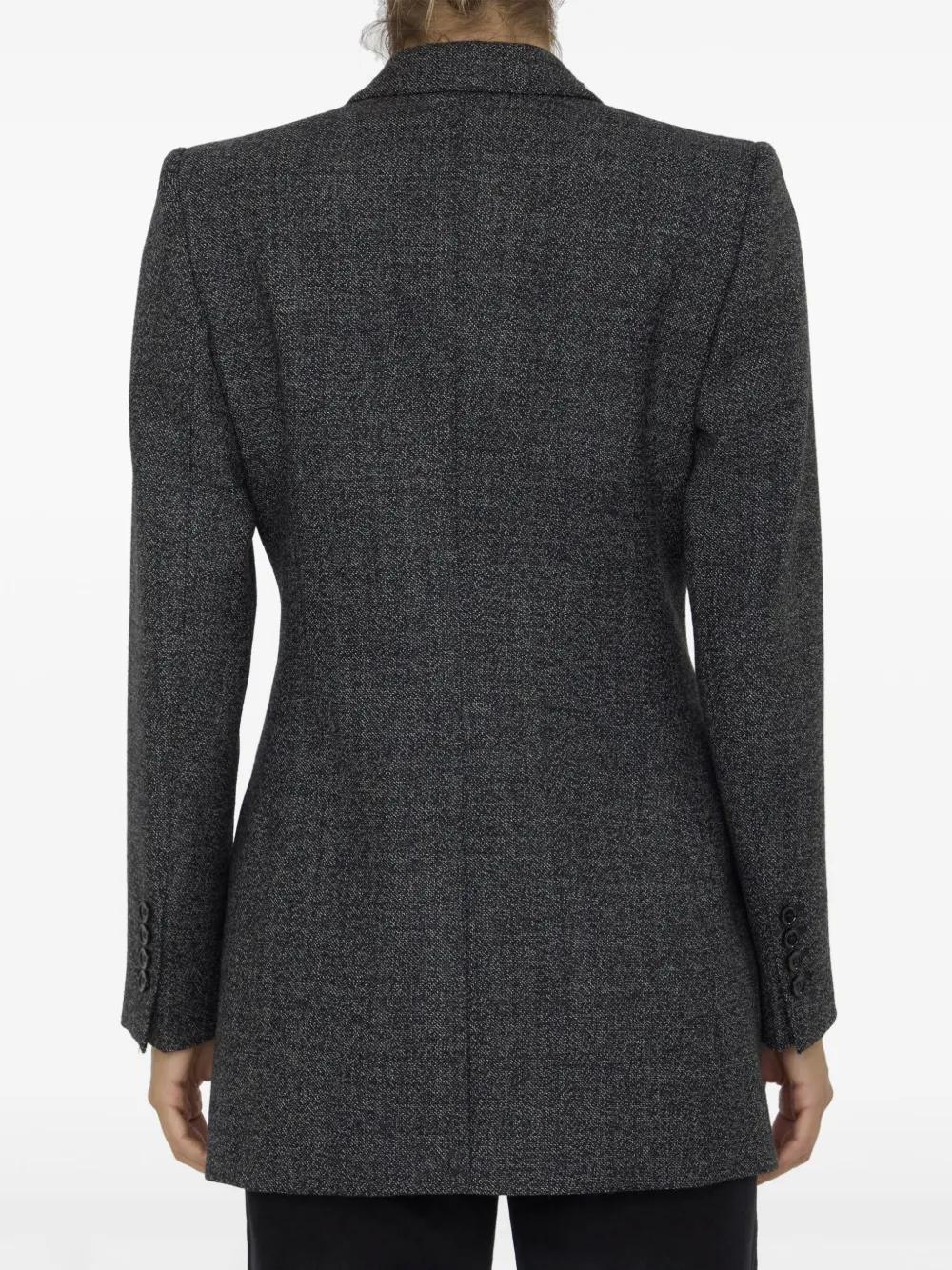 dark grey double-breasted button fastening two side flap pockets buttoned-cuff sleeves central rear vent