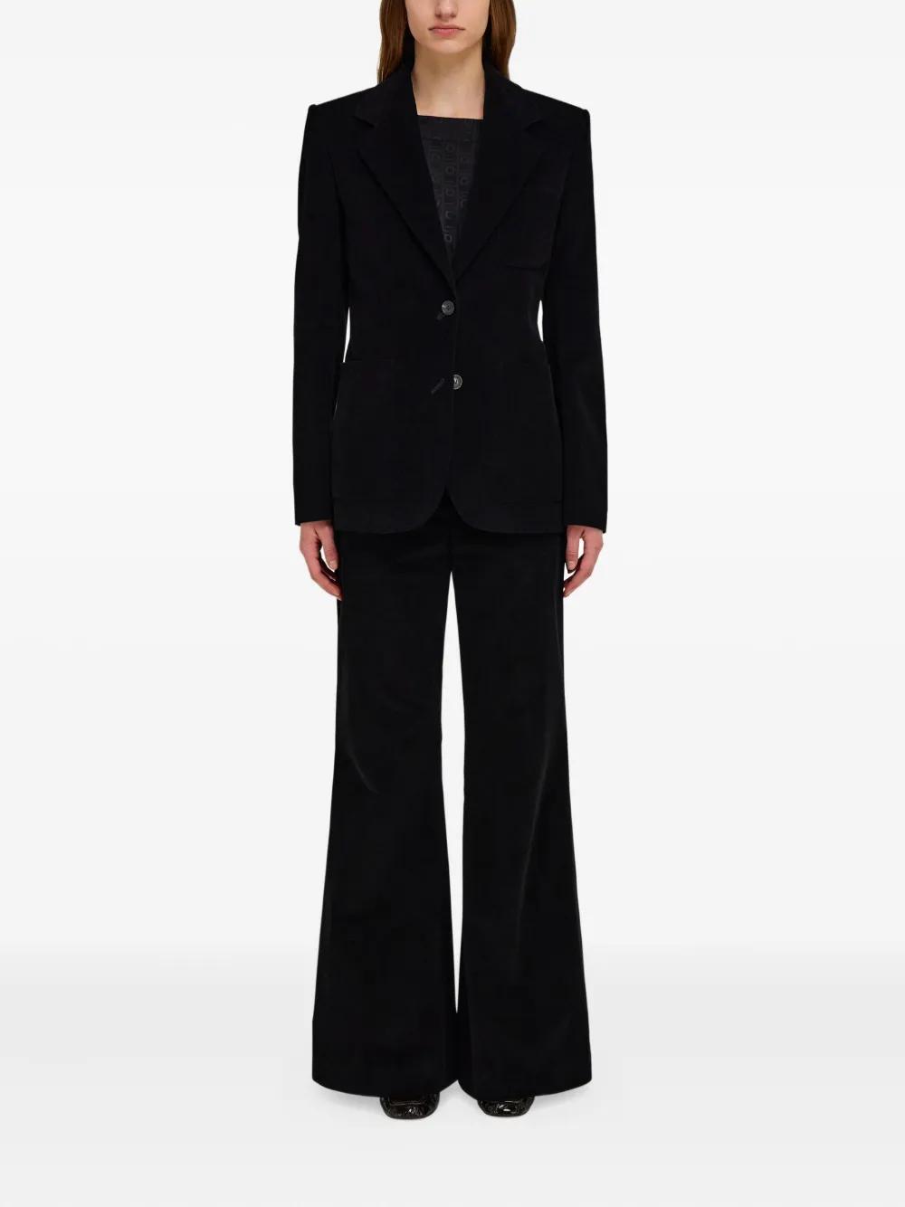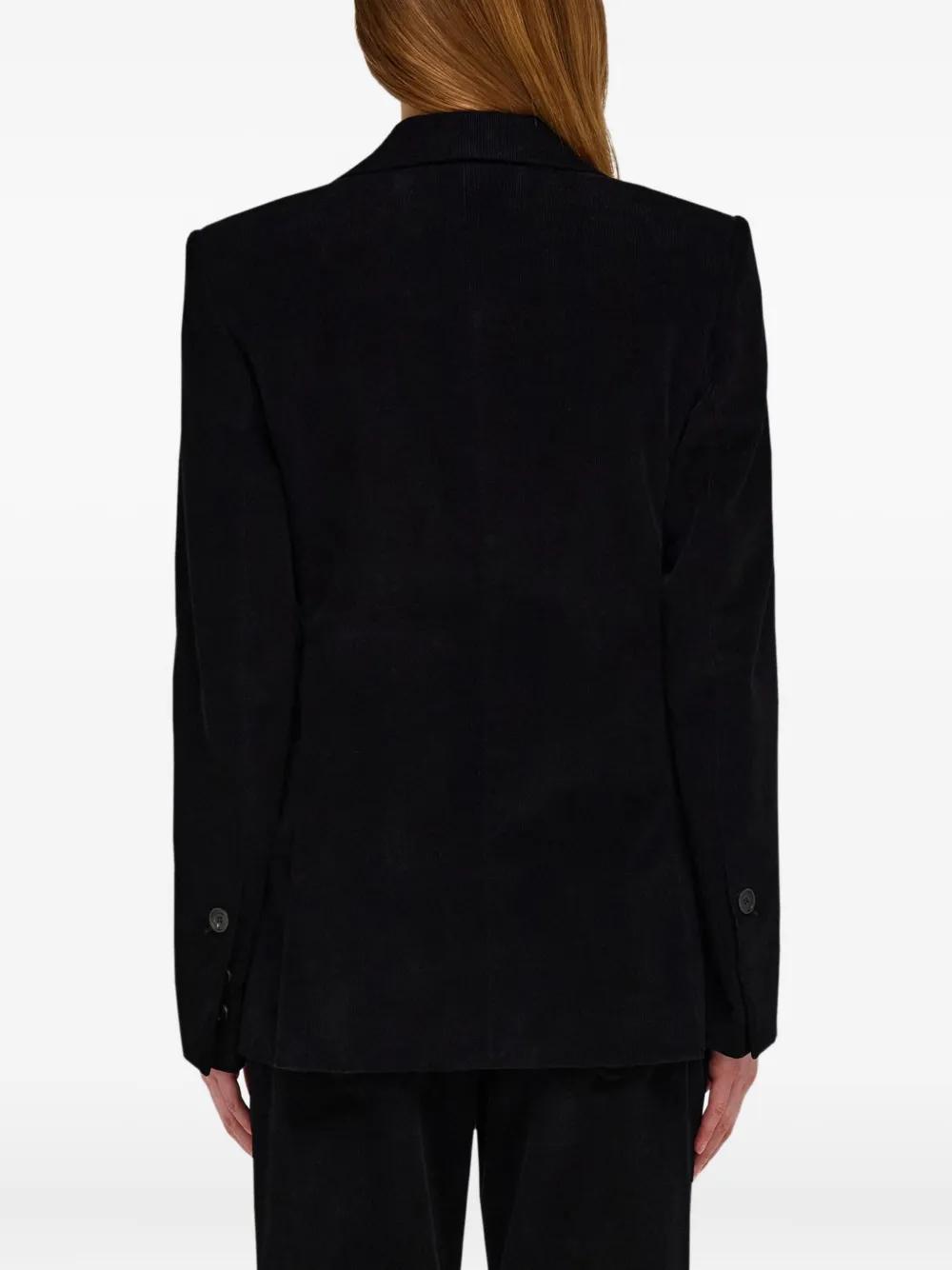 black front button fastening two patch pockets rear vents buttoned cuffs