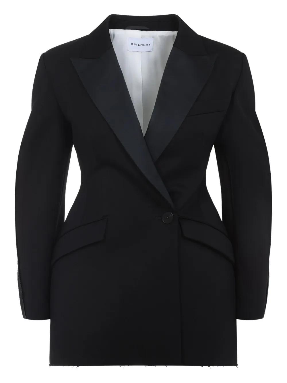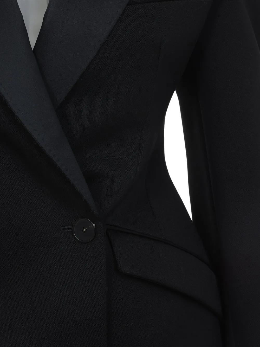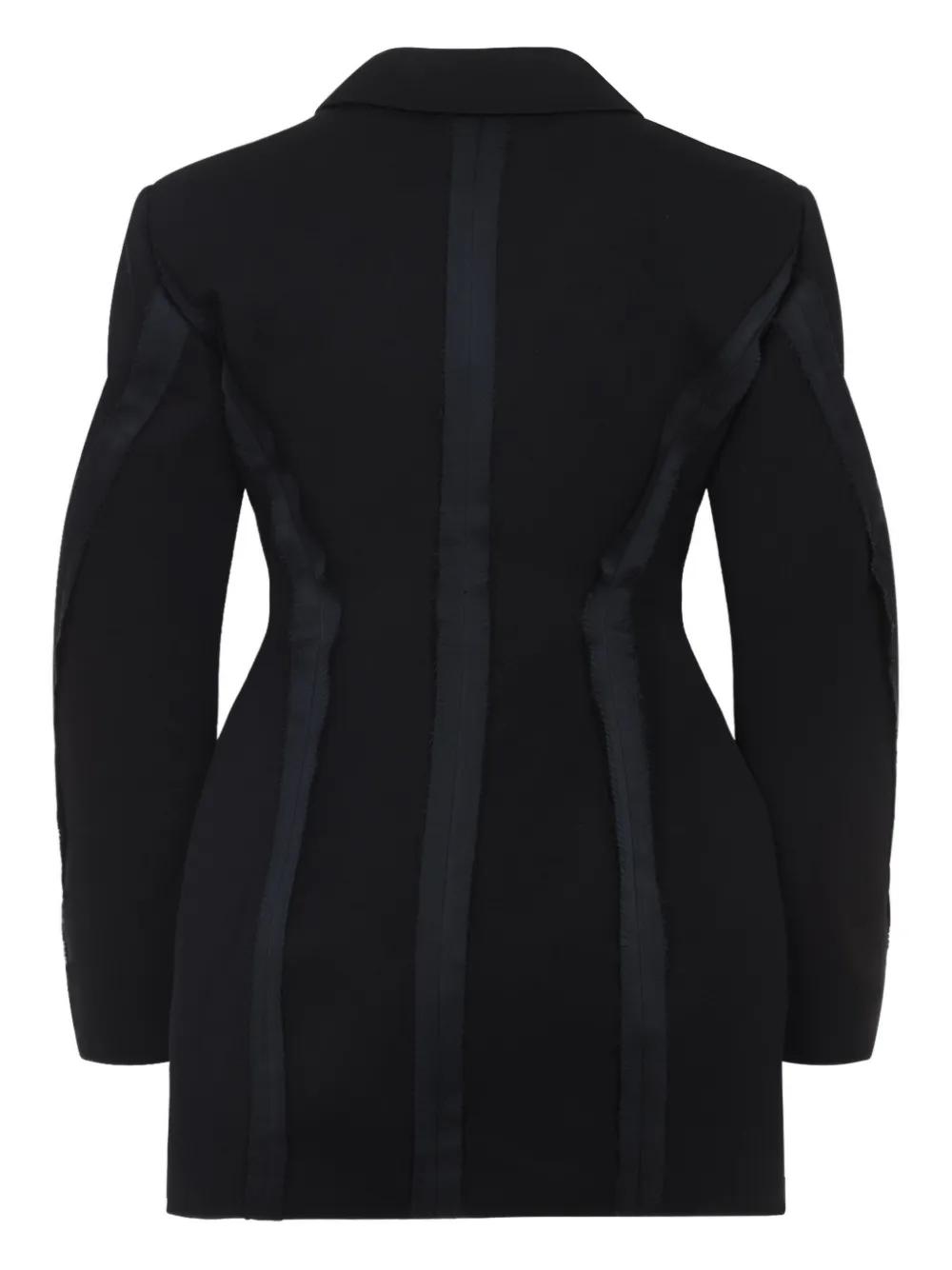 black peaked collar single-button fastening front flap pockets raw-cut hem