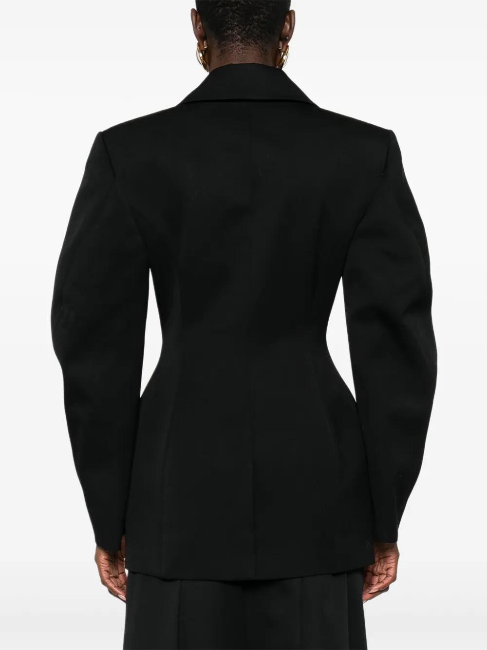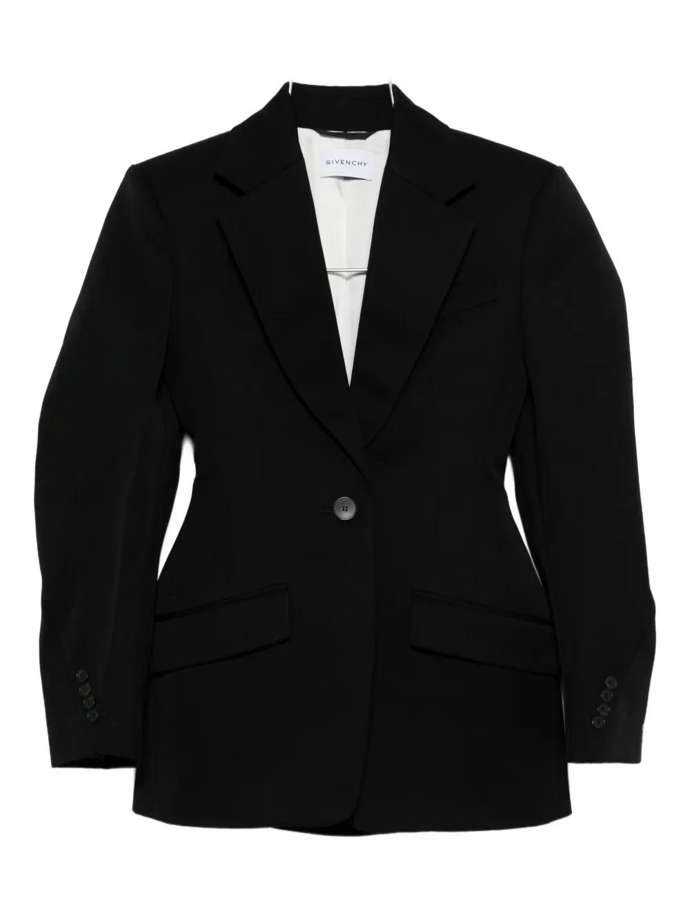black front button fastening front flap pockets long sleeves buttoned cuffs notched lapels