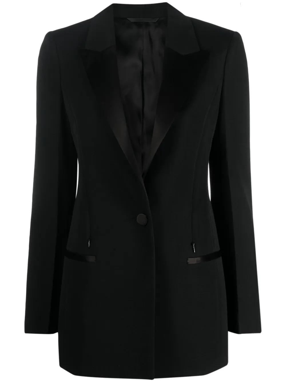 black wool/silk blend peak lapels front button fastening front zip fastening pockets two front welt pockets long sleeves straight hem