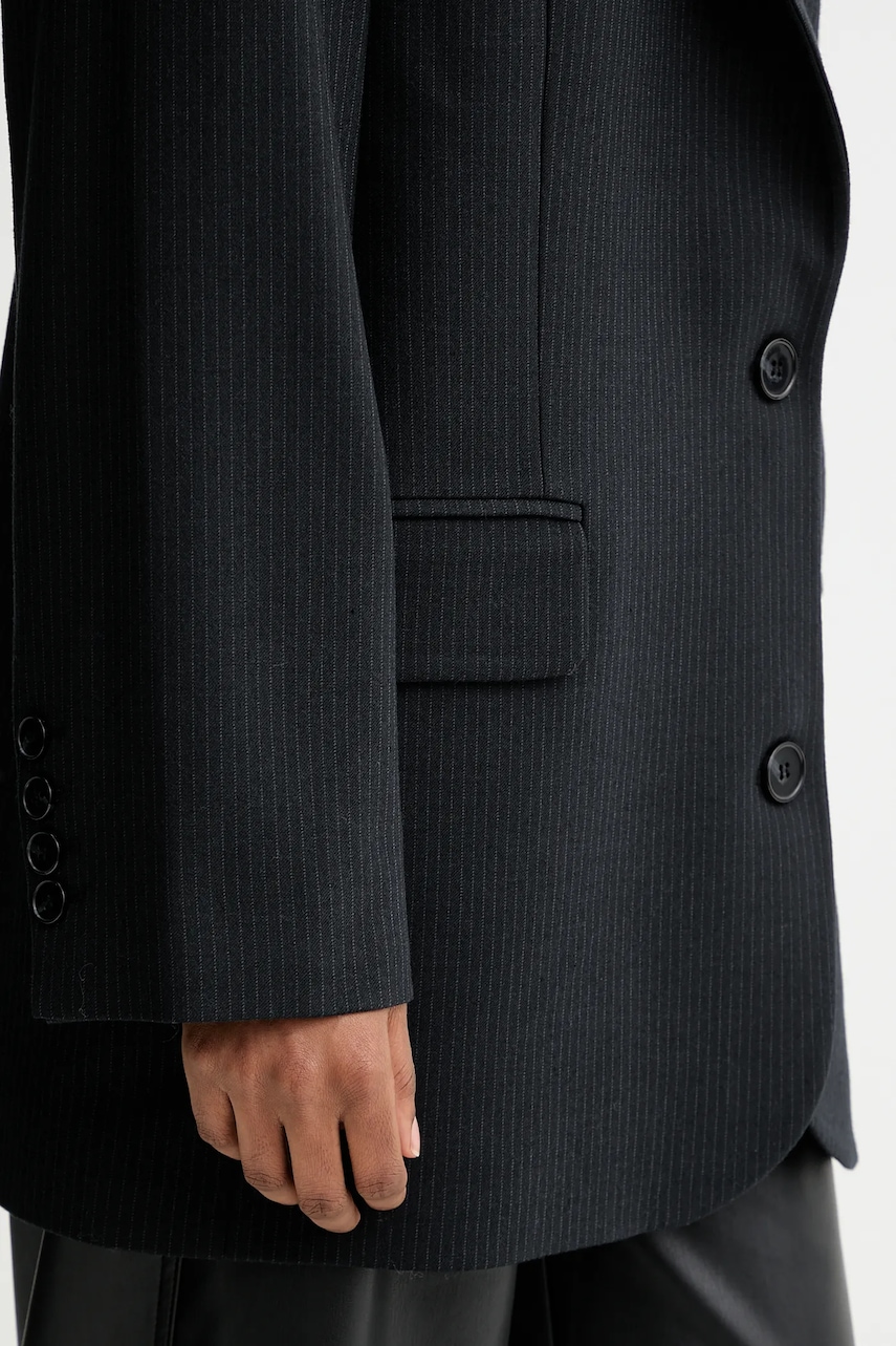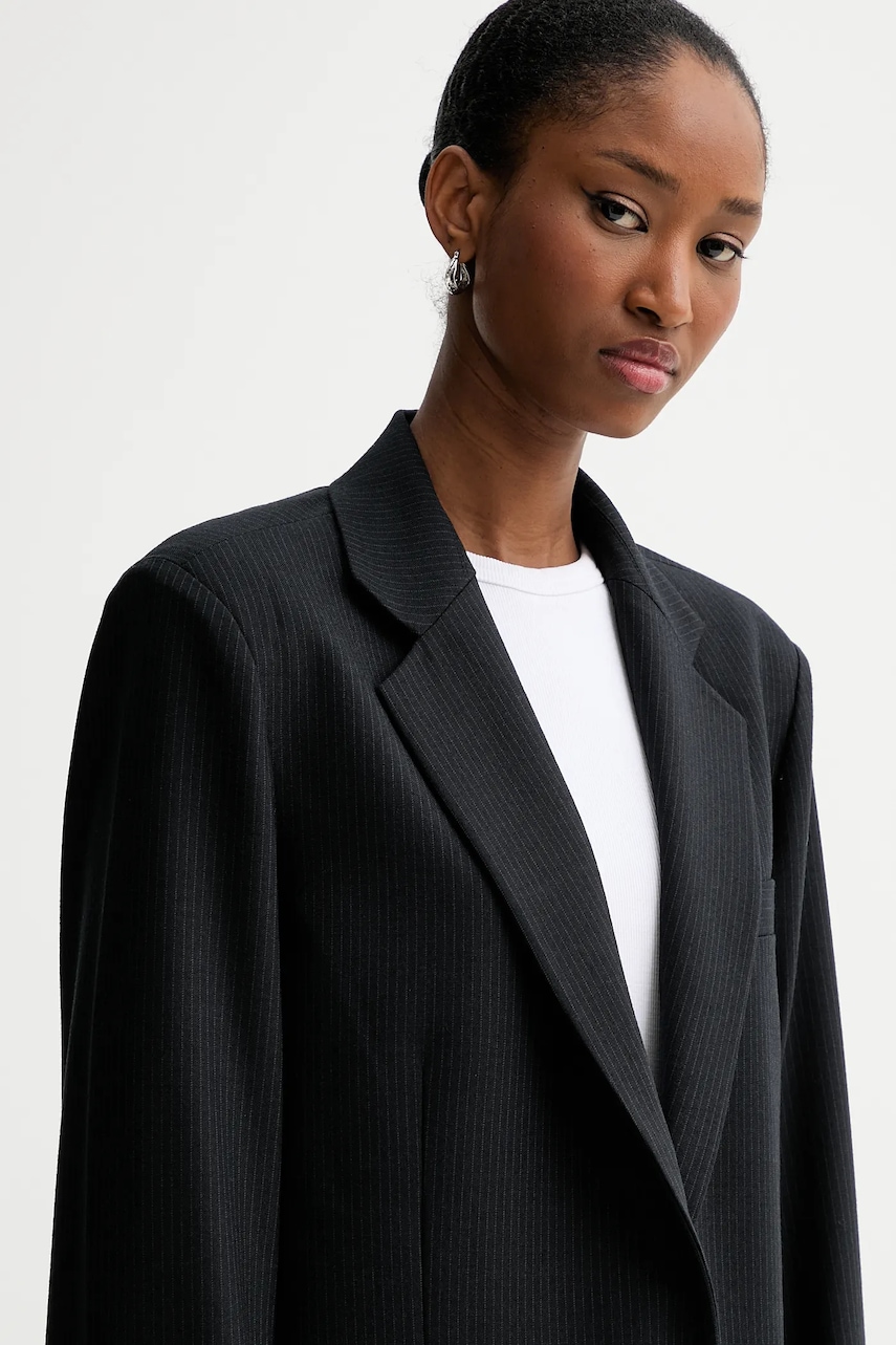 - Klasyczne klapy. - W ramiona wszyte poduszki. - Jednorzędowe zapięcie na guziki. - Mankiety zapinane na guziki. - Imitacja kieszeni z przodu. - Model na podszewce. - Prosty fason. - Długość rękawa: 60 cm. - Długość: 82 cm. - Szerokość pod pachami: 50 cm. - Wymiary podane dla rozmiaru: 36.