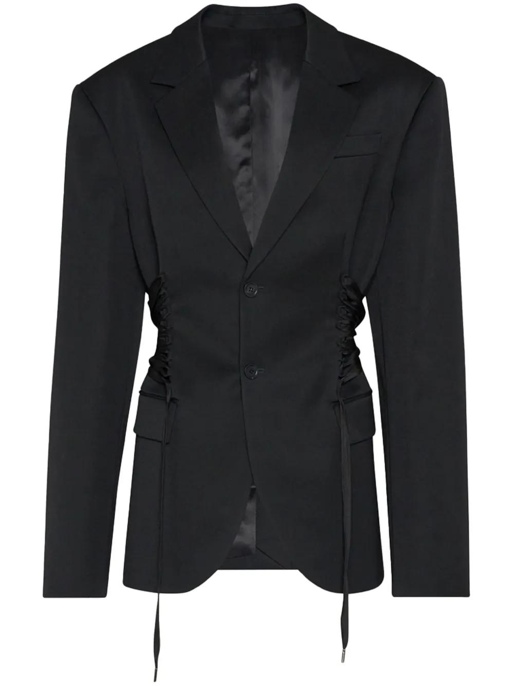 jet black virgin wool lace detailing front button fastening notched lapels shoulder pads long sleeves buttoned cuffs two front flap pockets central rear vent full lining straight hem