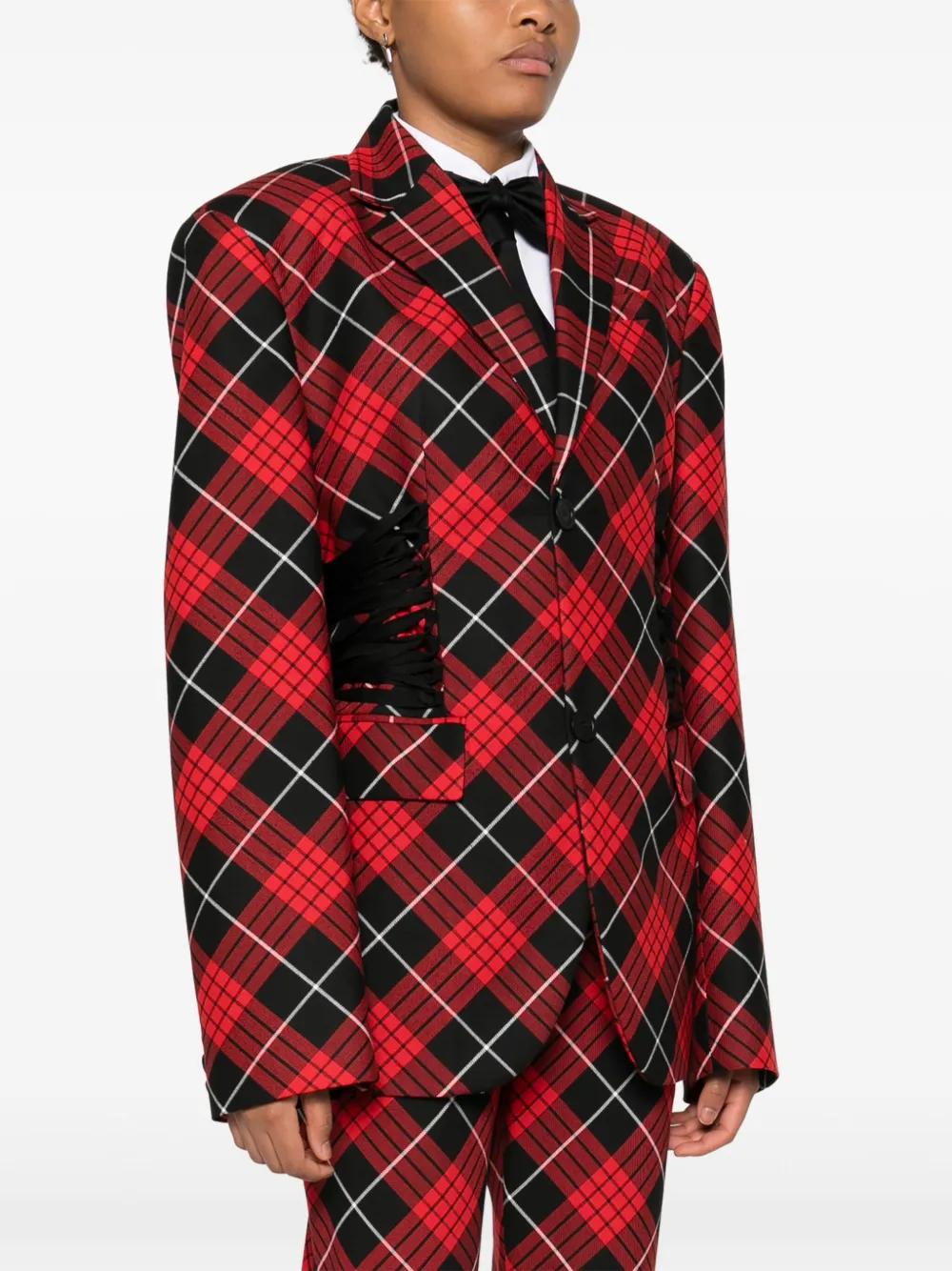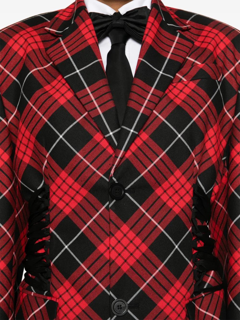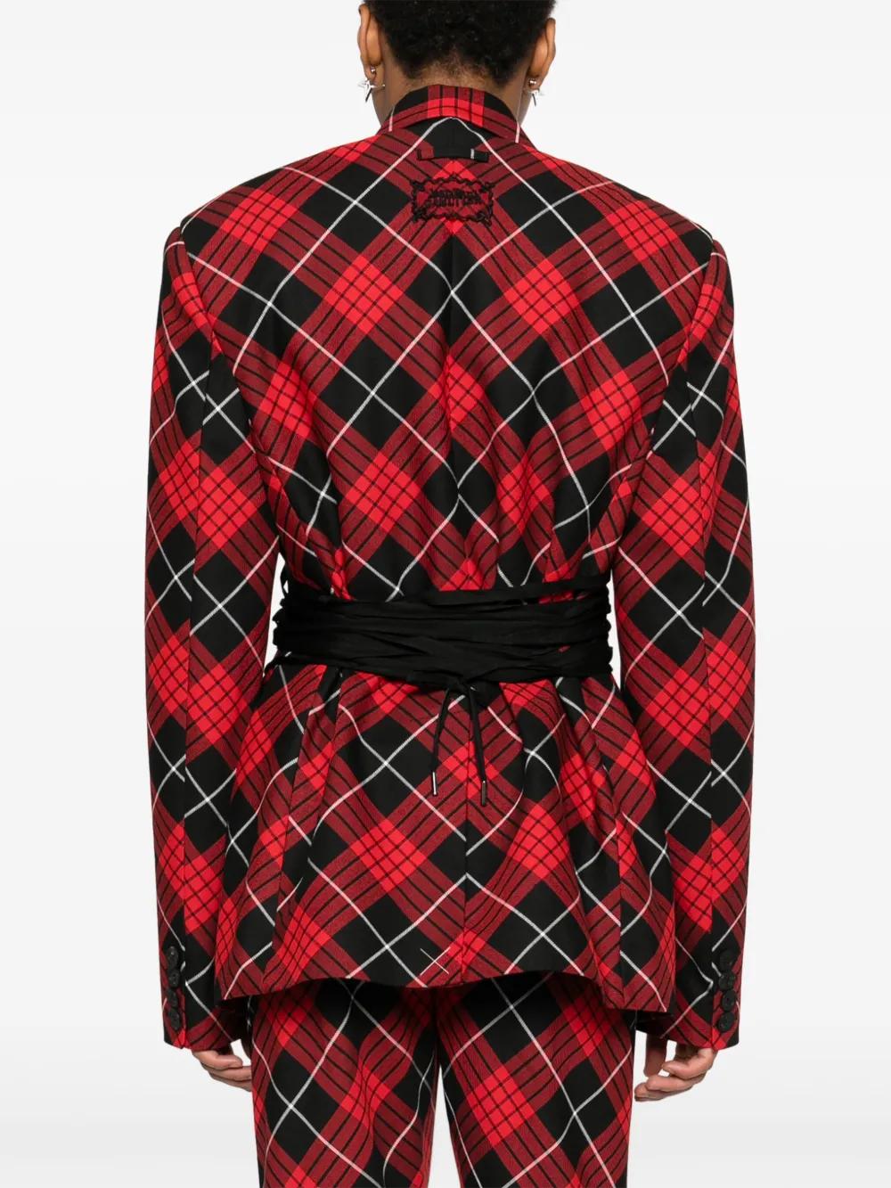black/red twill weave front button fastening notched lapels shoulder pads long sleeves with buttoned cuffs chest welt pocket two front flap pockets draped strap detailing American rear vent full lining straight hem