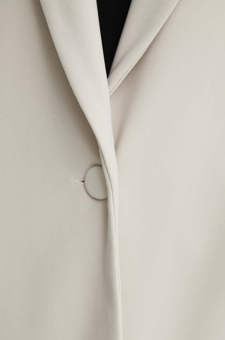 - Prosty, nie blokujący ruchów fason. - Model na podszewce. - Zapięcie na guziki. - W ramiona wszyte poduszki. - Długość rękawa: 64 cm. - Imitacja kieszeni. - Szerokość pod pachami: 47 cm. - Szerokość w ramionach: 37 cm. - Długość: 76 cm. - Wymiary podane dla rozmiaru: 36.