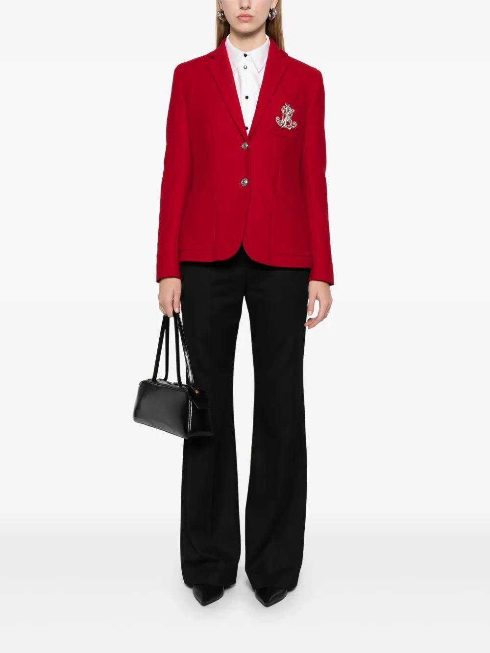 poppy red front button fastening notched lapels logo patch at the chest three front patch pockets shoulder pads long sleeves buttoned cuffs American rear vent full lining straight hem
