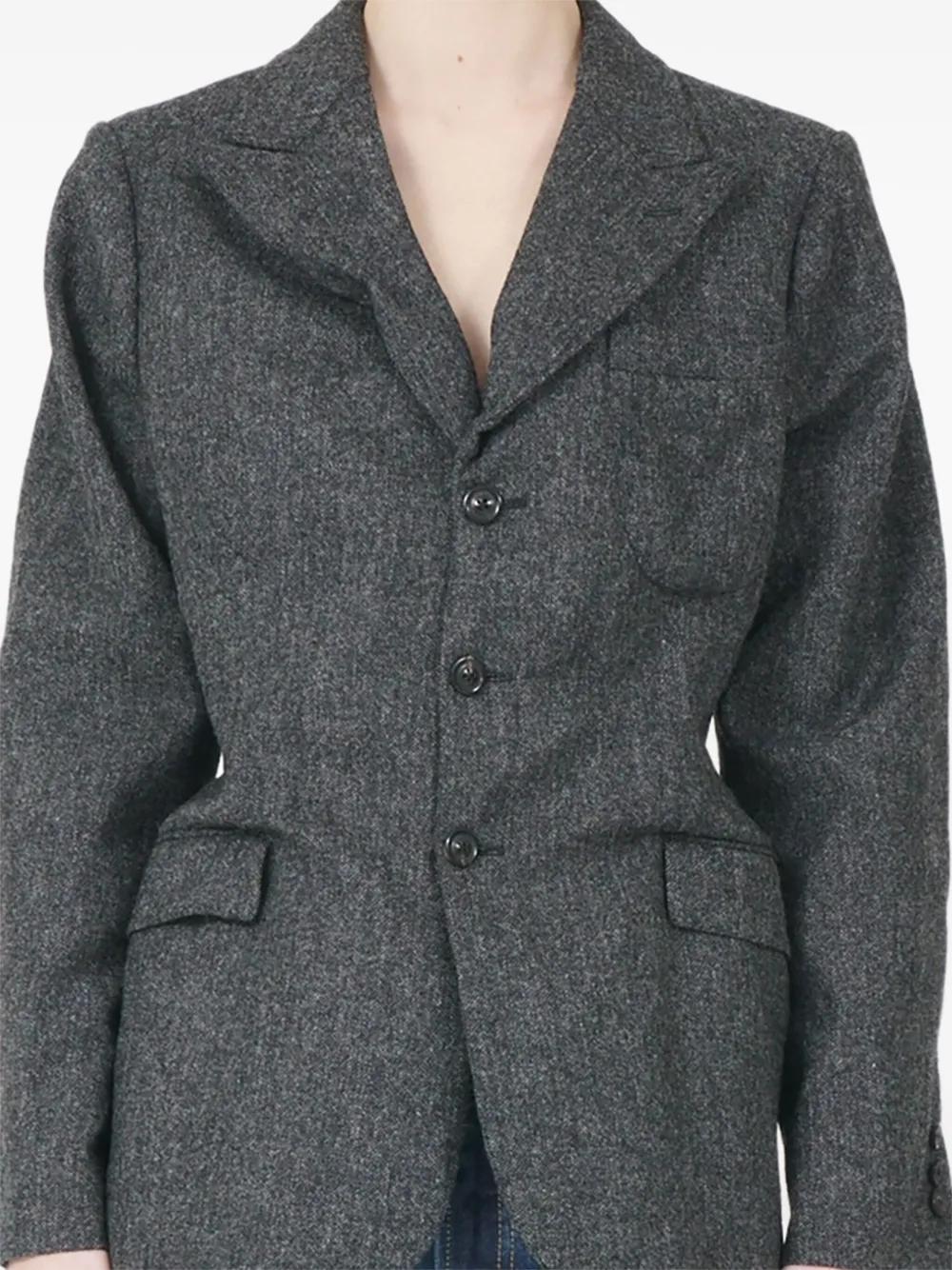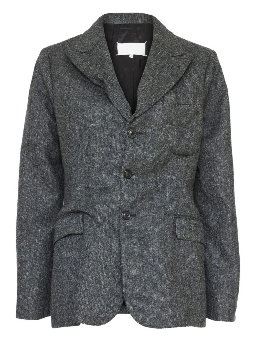 dark grey wool tweed texture button fastening notched lapel flap pockets