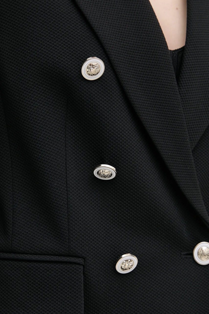 - W ramiona wszyte poduszki. - Dopasowany, podkreślający sylwetkę fason. - Klasyczne klapy. - Model na podszewce. - Dwurzędowe zapięcie na guziki. - Model z ozdobnymi patkami.