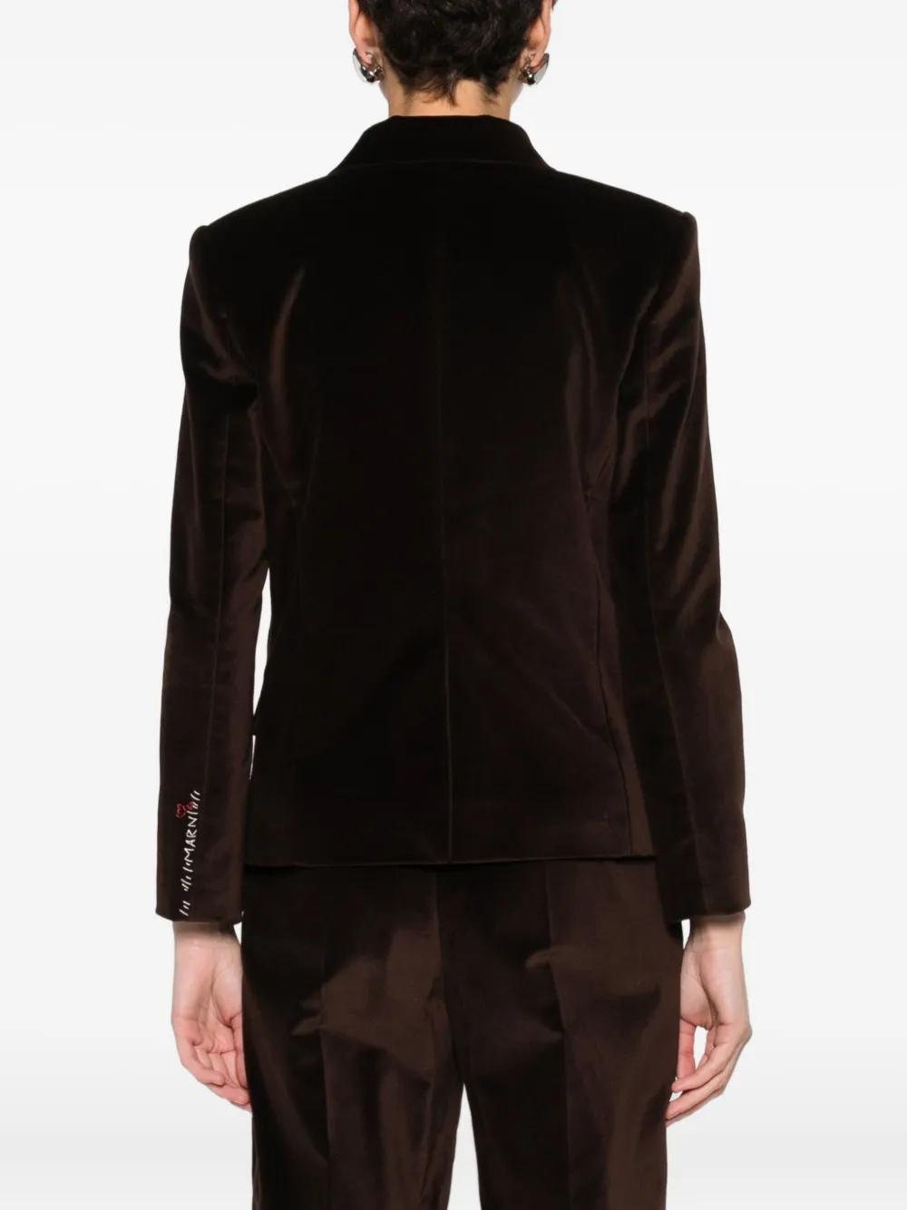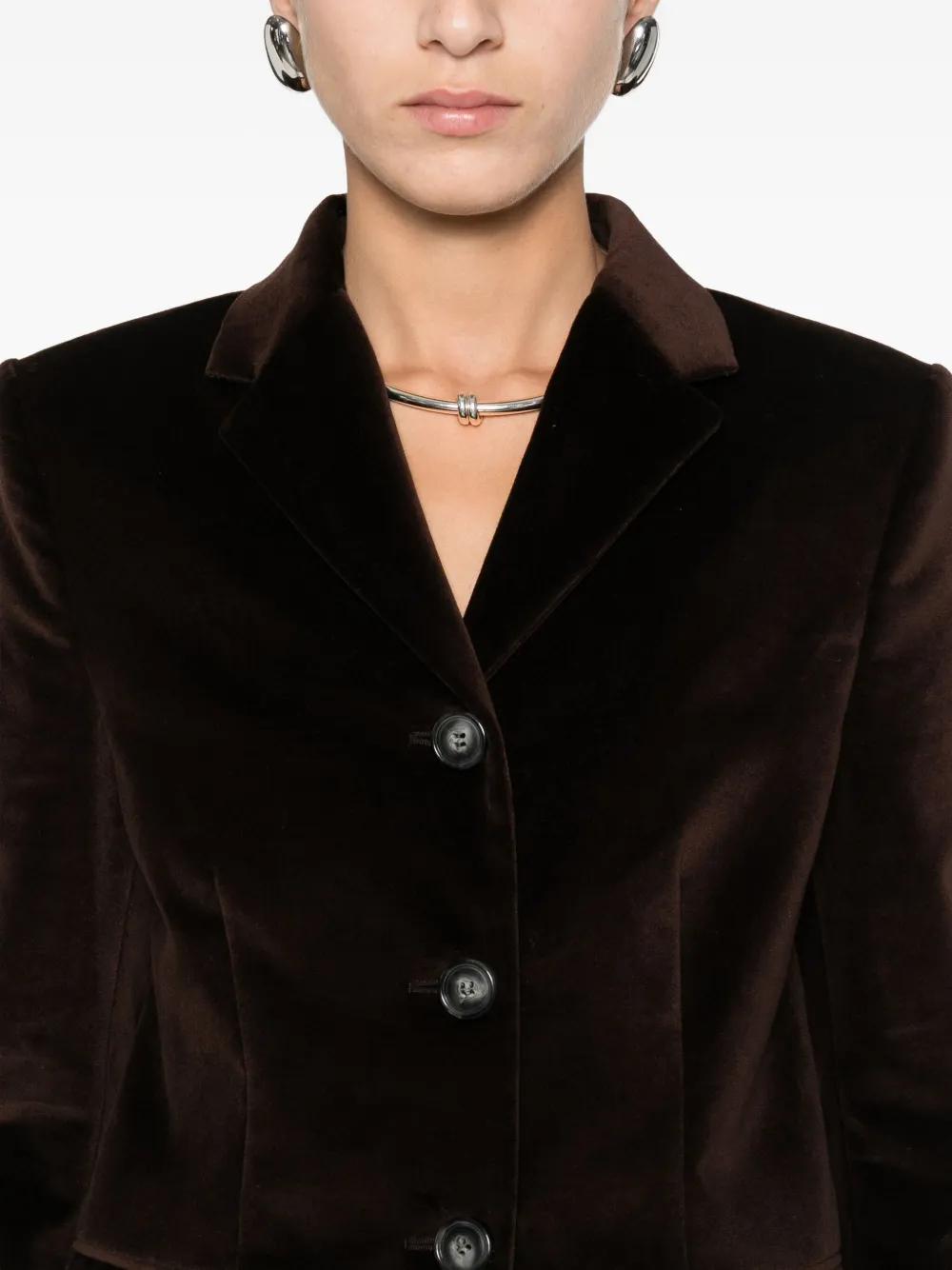 dark brown front button fastening notched lapels front flap pockets long sleeves straight hem