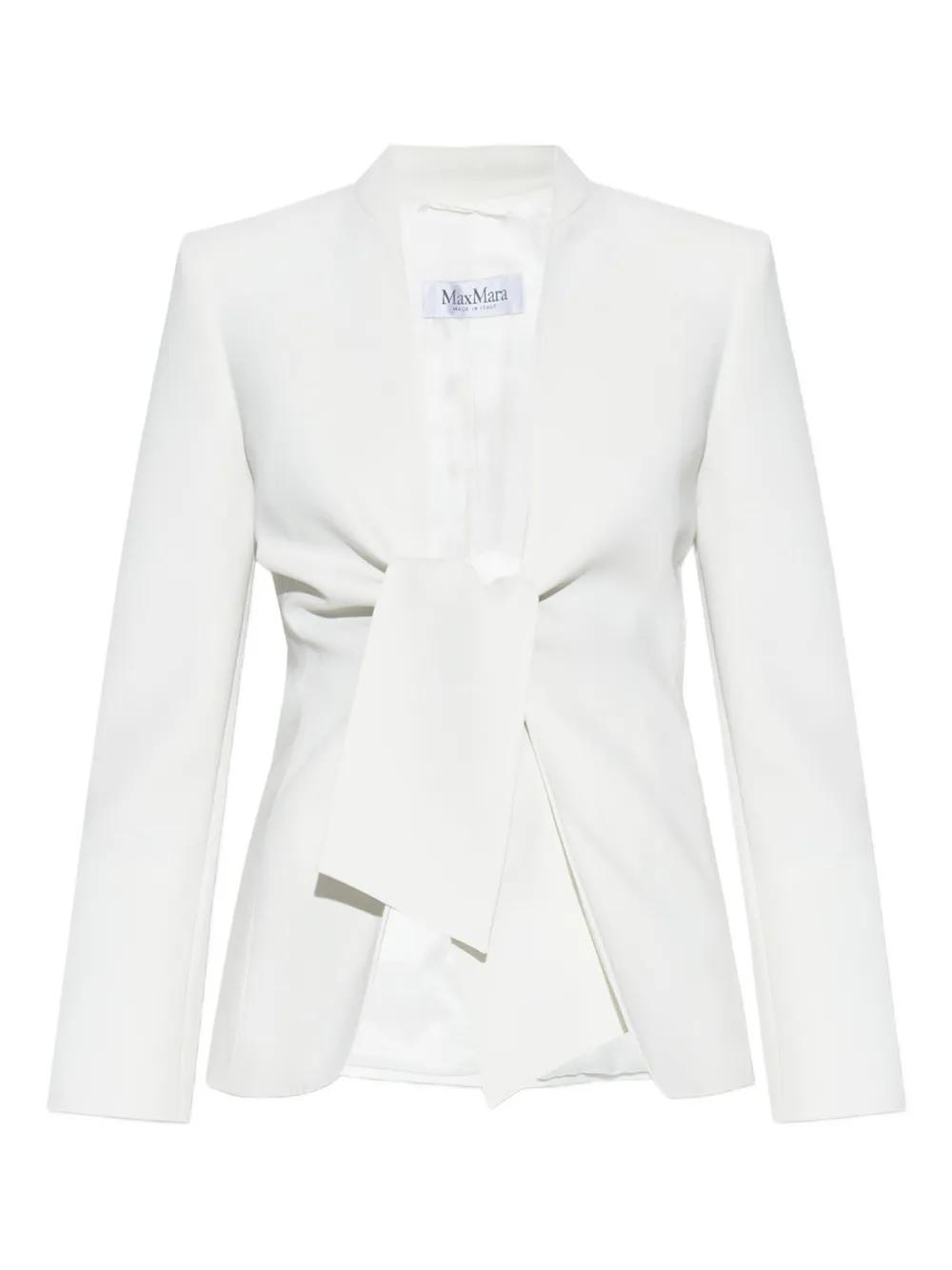 white deep v-neckline asymmetric bow tie detail long sleeves
