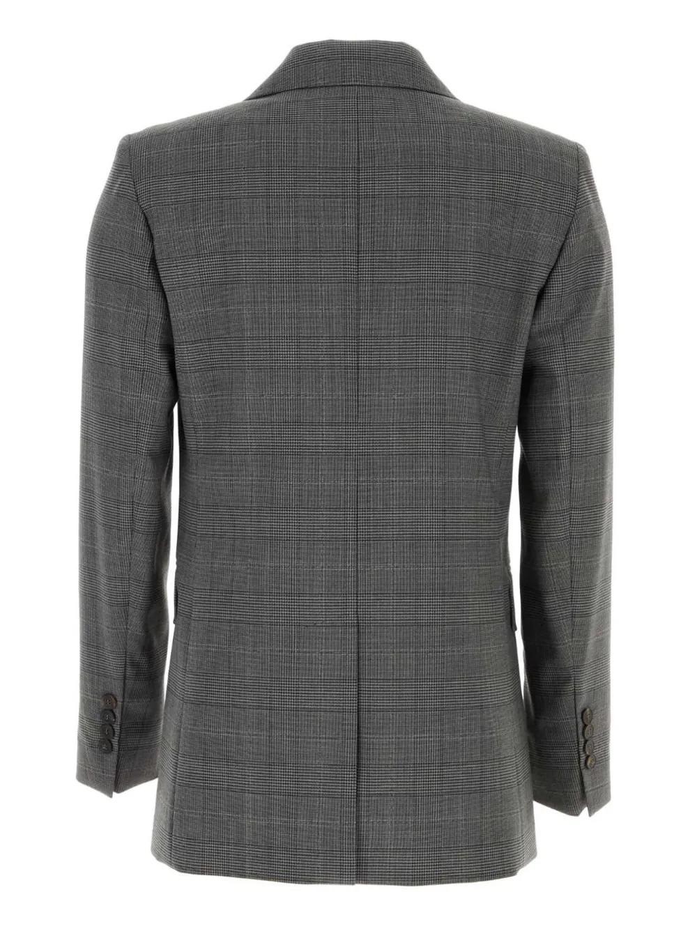 slate grey virgin wool blend front button fastening Prince of Wales check pattern notched lapels long sleeves buttoned cuffs two side flap pockets central rear vent full lining curved hem