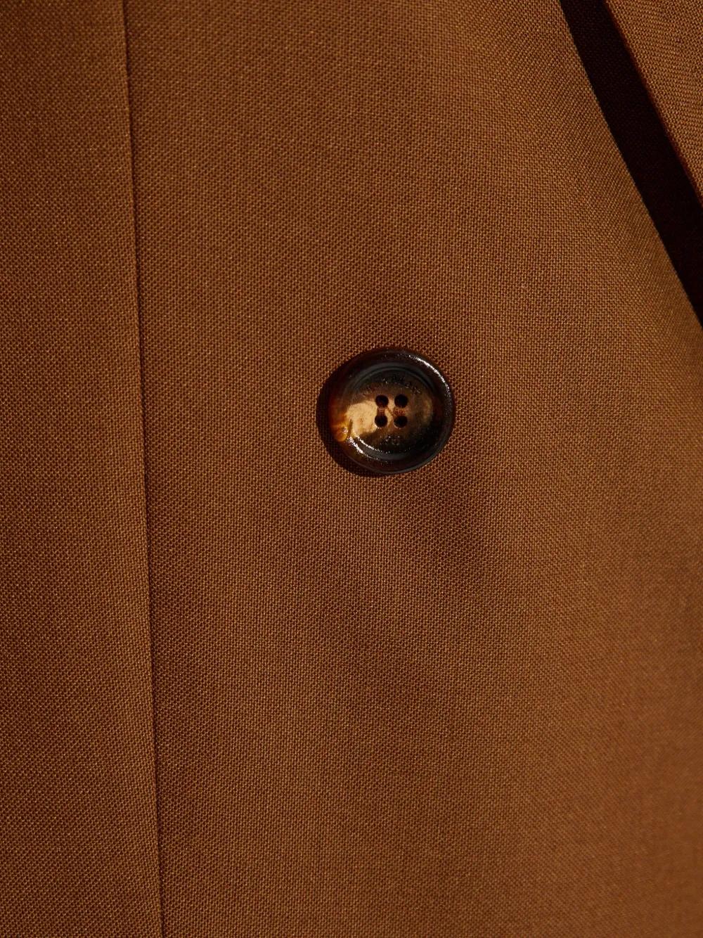 chocolate brown double-breasted button fastening chest welt pocket two side flap pockets English rear vents