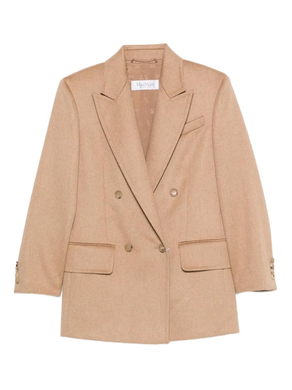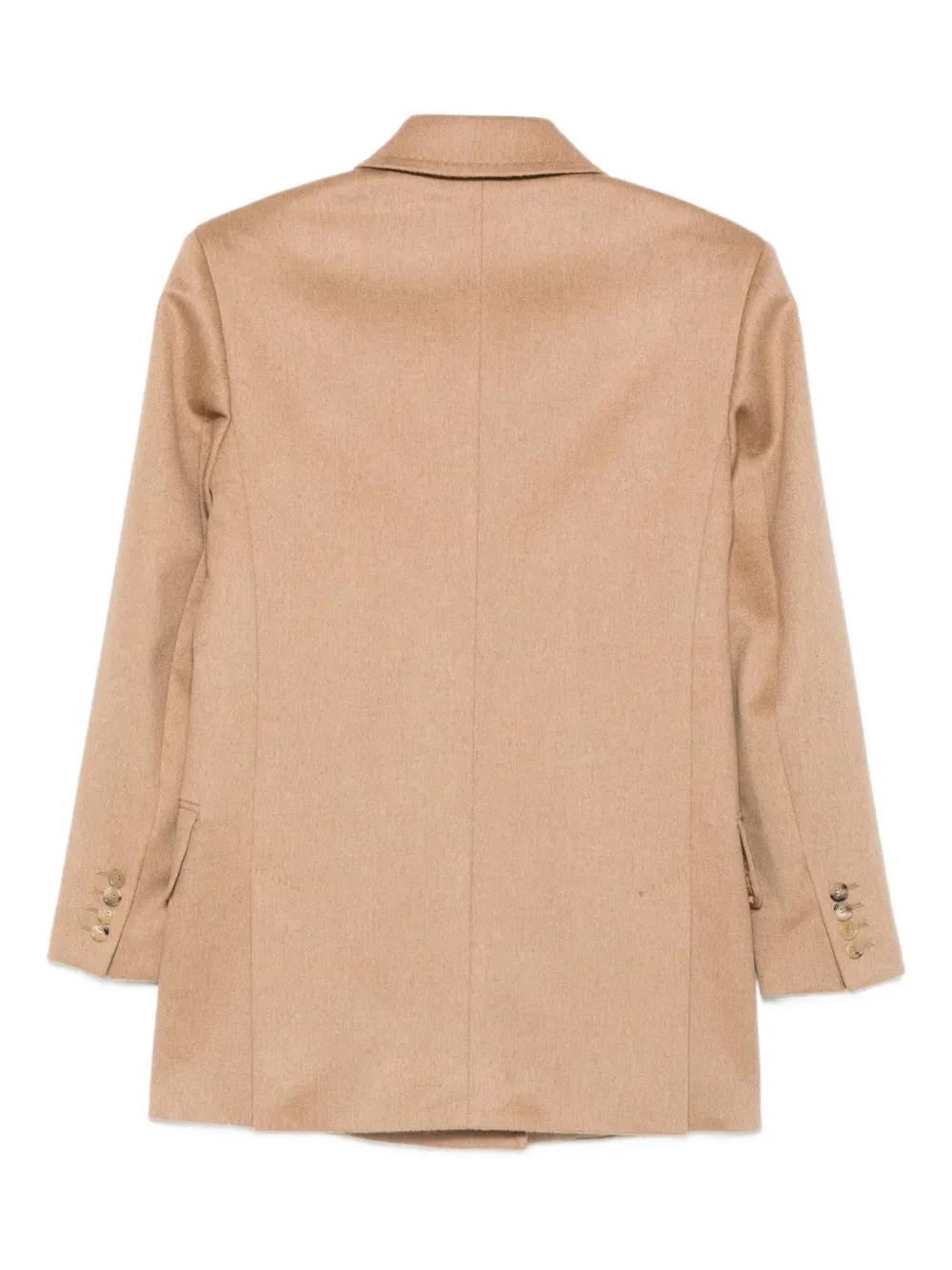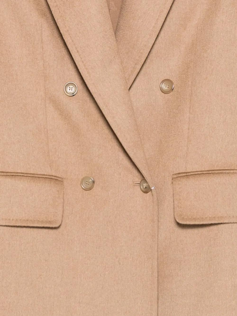 camel double-breasted peak lapels welt pockets long sleeves buttoned cuffs
