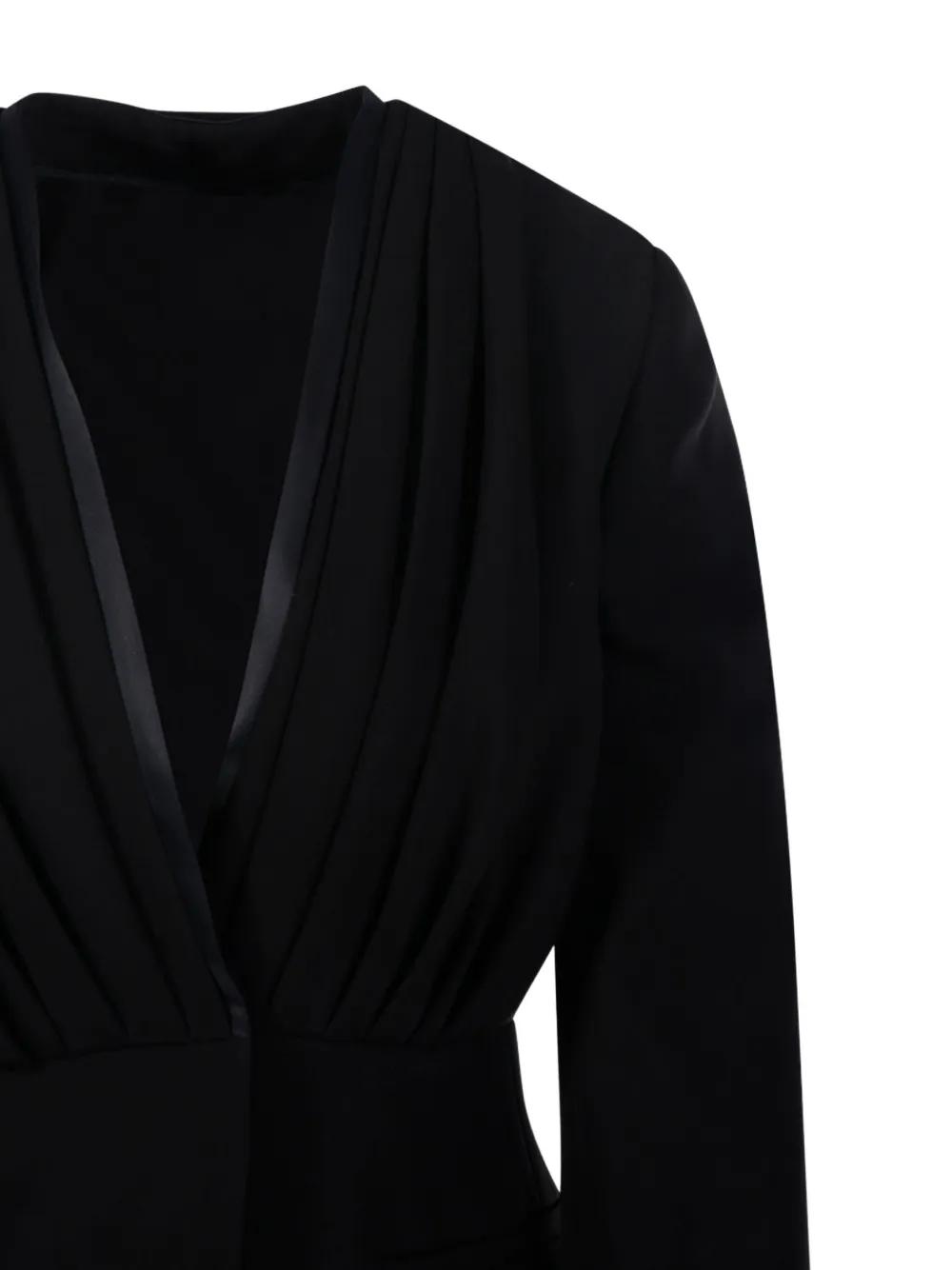 black deep V-neck front draping long sleeves side pockets satin finish detailing