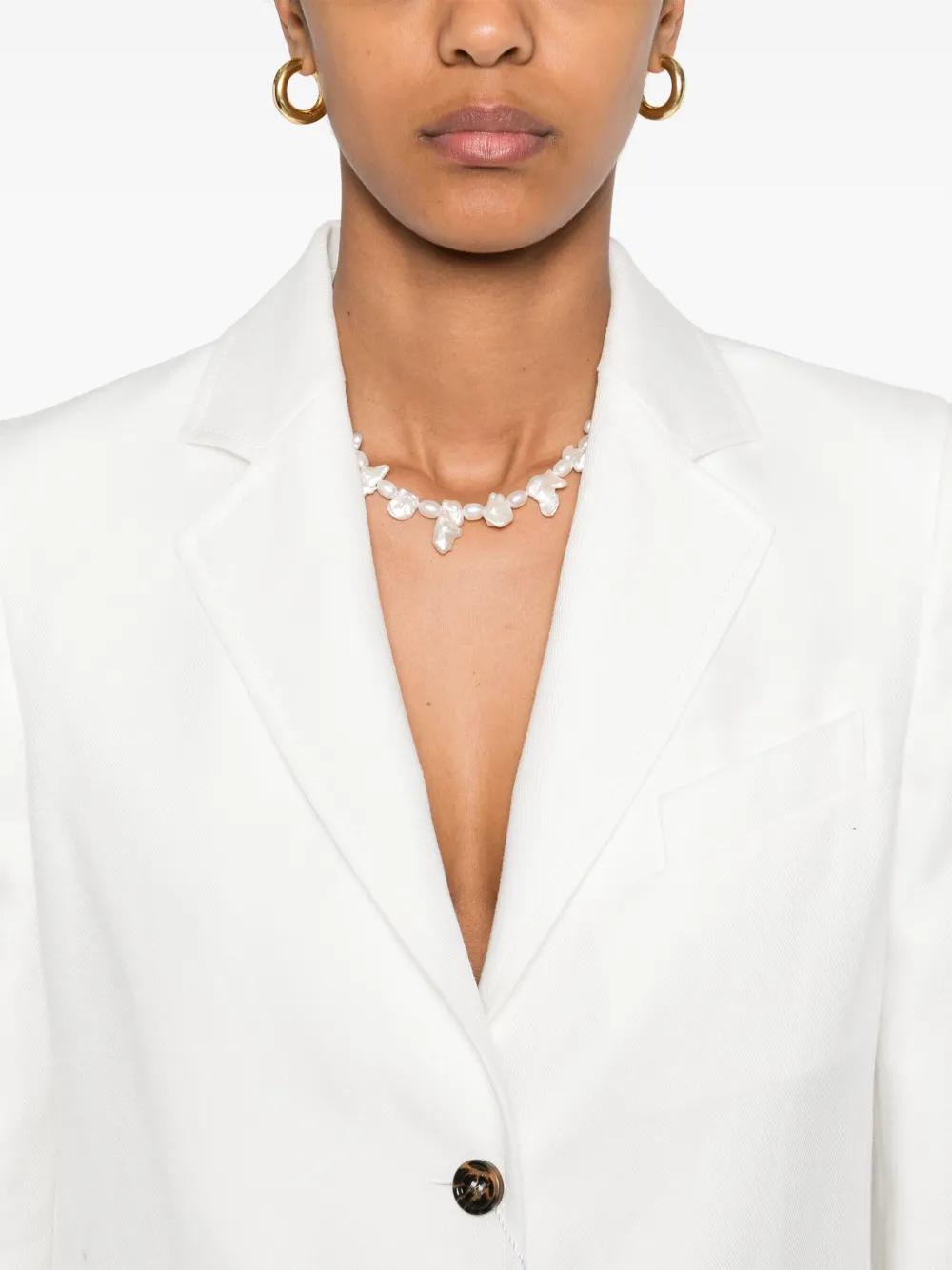 white front button fastening shoulder pads two side patch pockets American rear vent