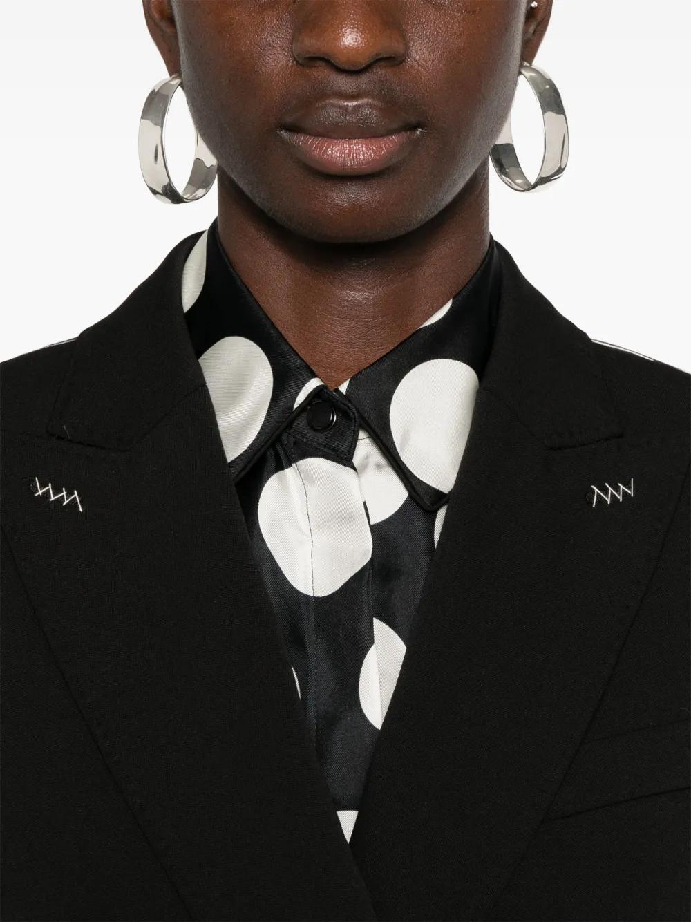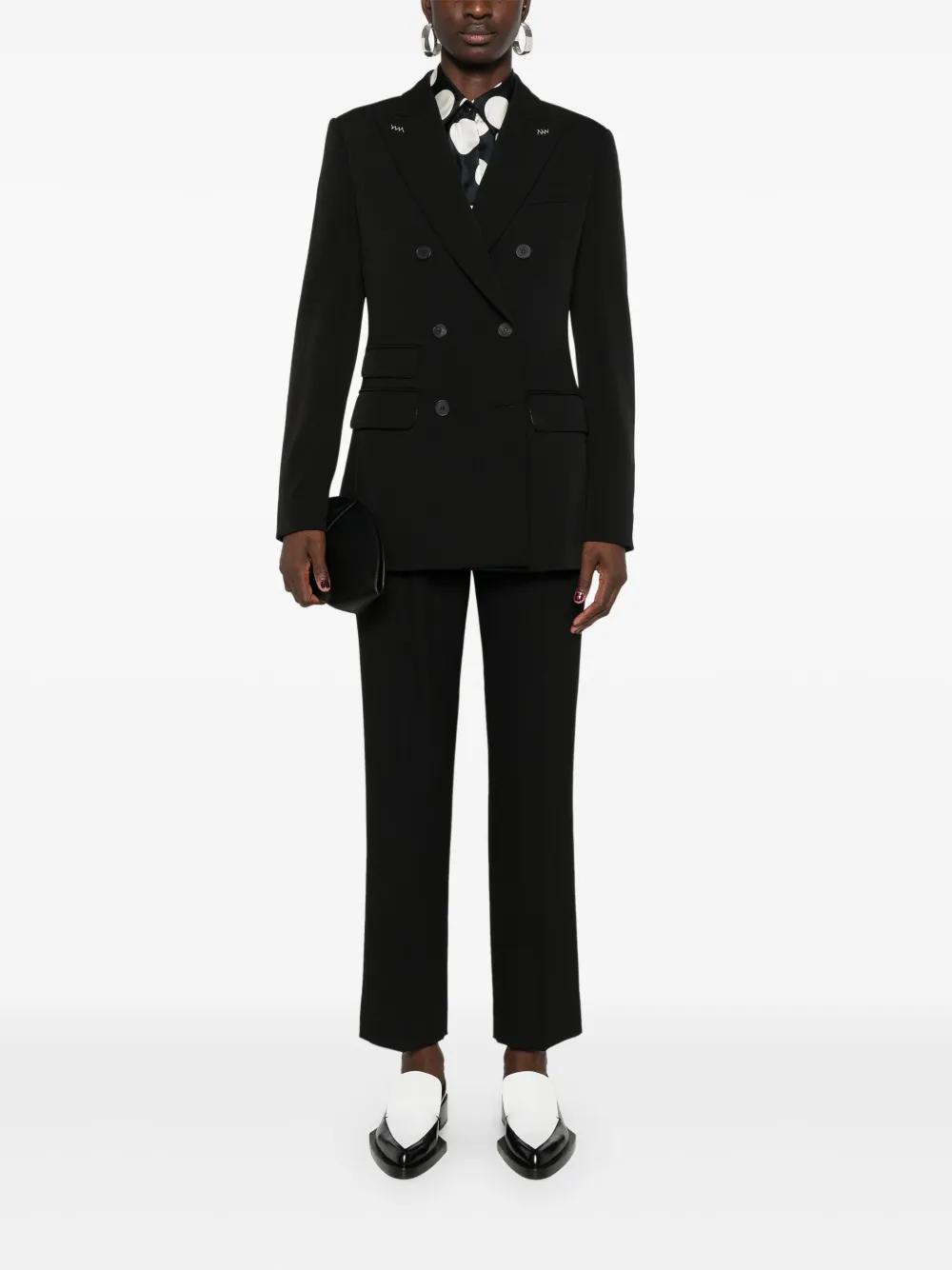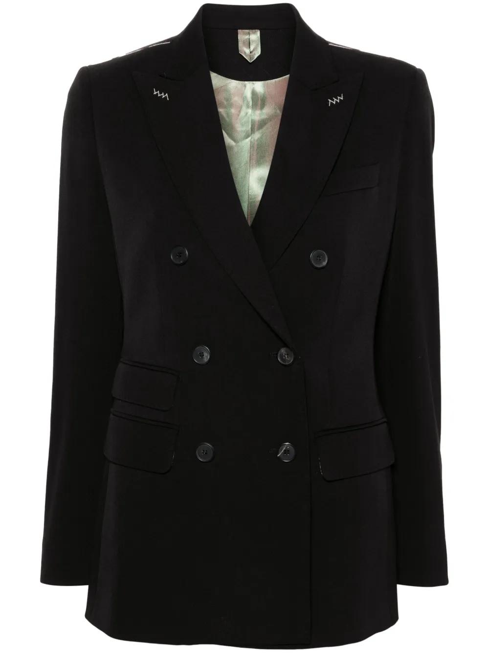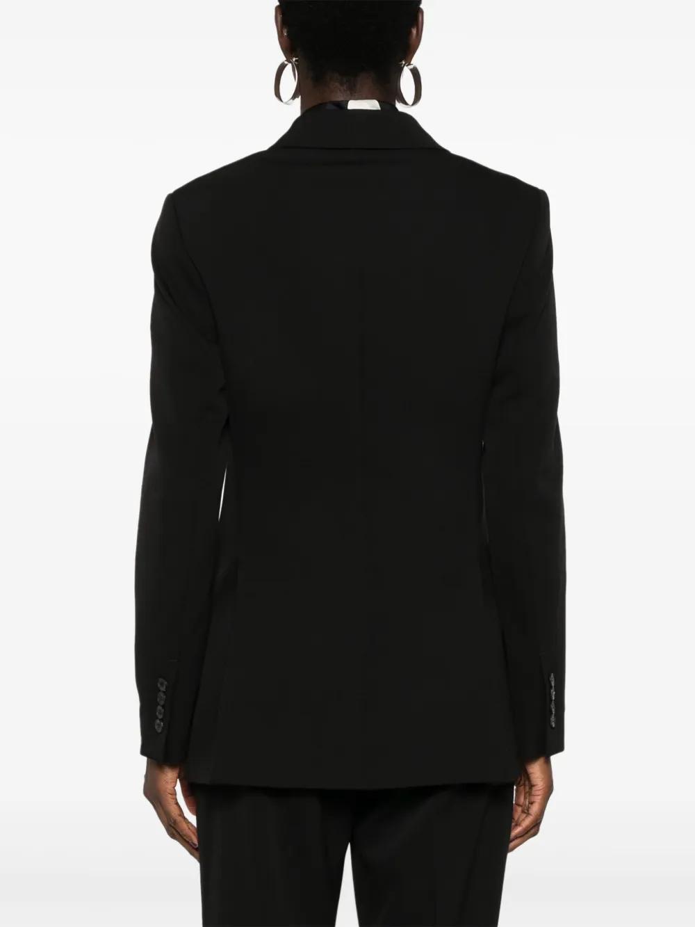 black virgin wool blend double-breasted button fastening peak lapels chest welt pocket two front flap pockets shoulder pads long sleeves buttoned cuffs central rear vent straight hem full lining internal jetted pocket