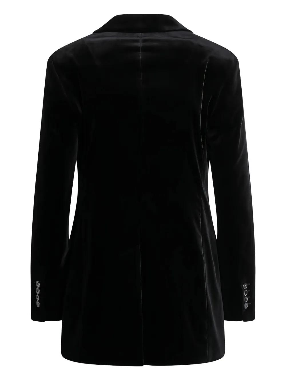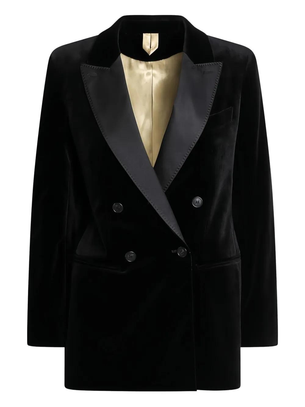 black textured panel double-breasted peak lapels front button fastening front jetted pockets