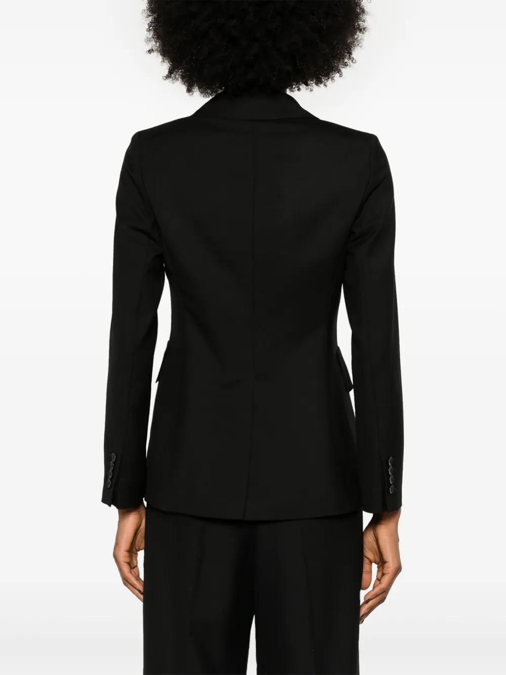 black wool peak lapels long sleeves faux-buttoned cuffs two side flap pockets central rear vent full lining straight hem double-breasted button fastening