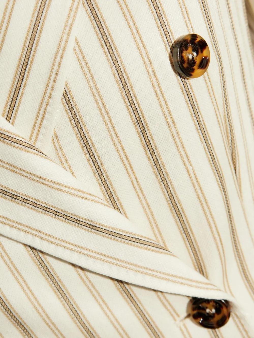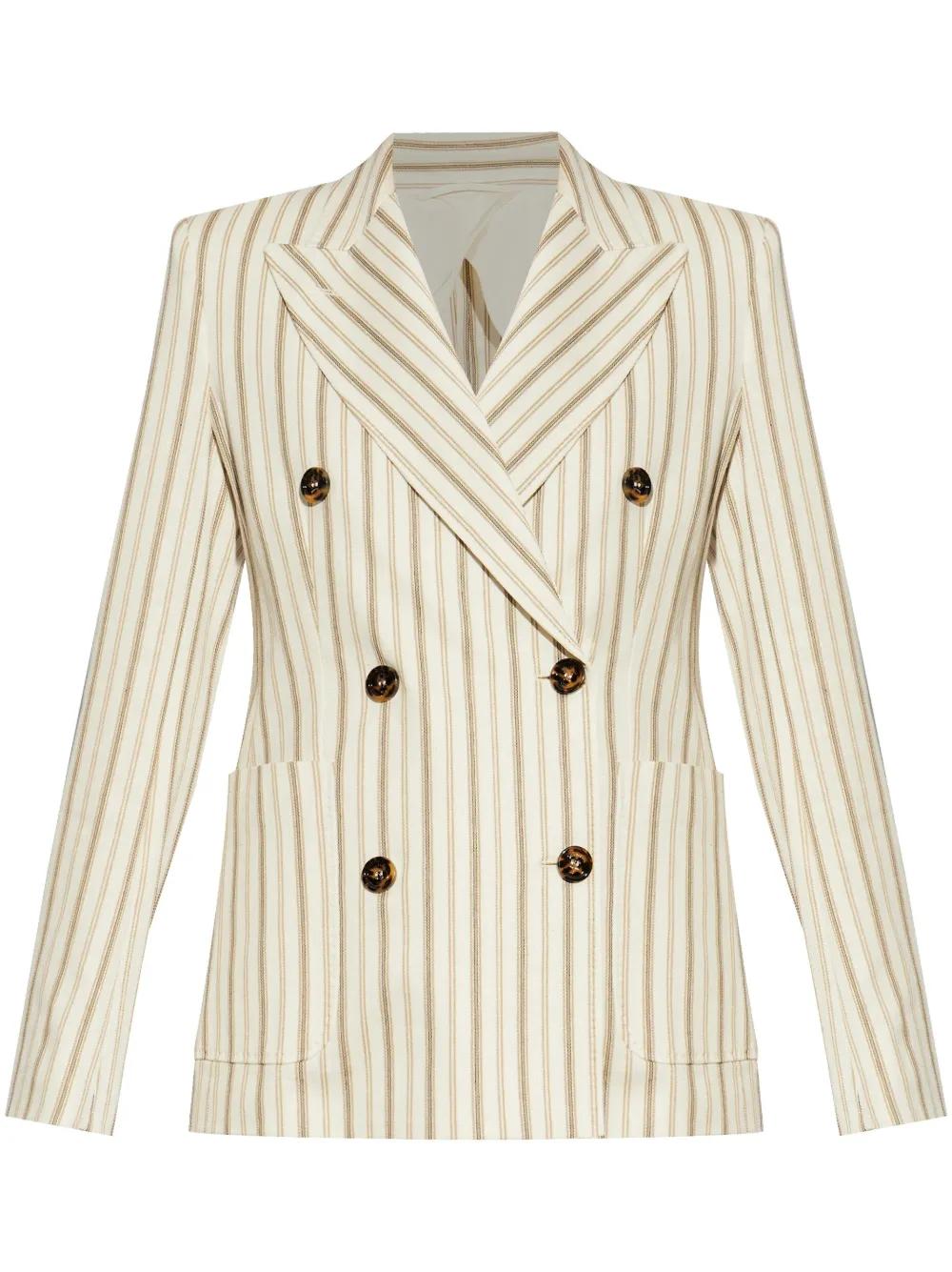 cream beige vertical stripes double-breasted front notched lapel button fastening long sleeves structured shoulders tailored silhouette peak design details