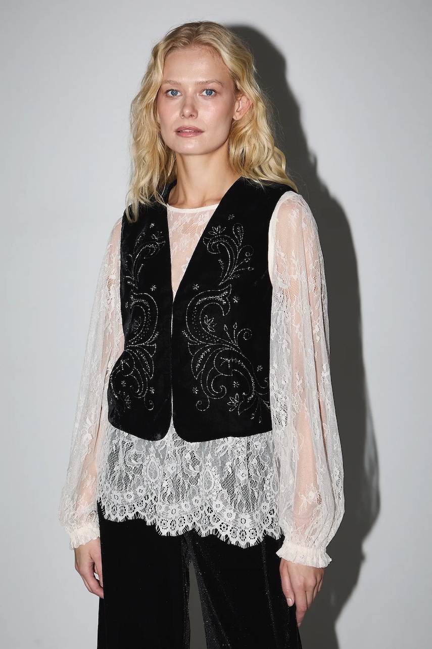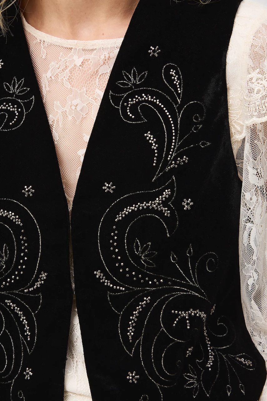 - Fason regular. - Zapięcie na haftki. - Model z ozdobną aplikacją. - Model na podszewce. - Szerokość w biuście: 49,5 cm. - Długość: 50,5 cm. - Wymiary podane dla rozmiaru: S.
