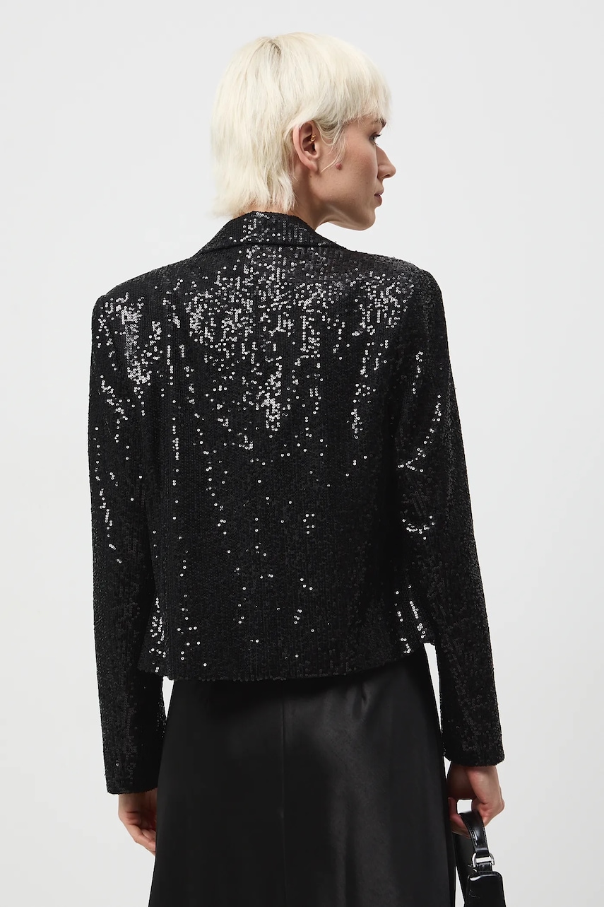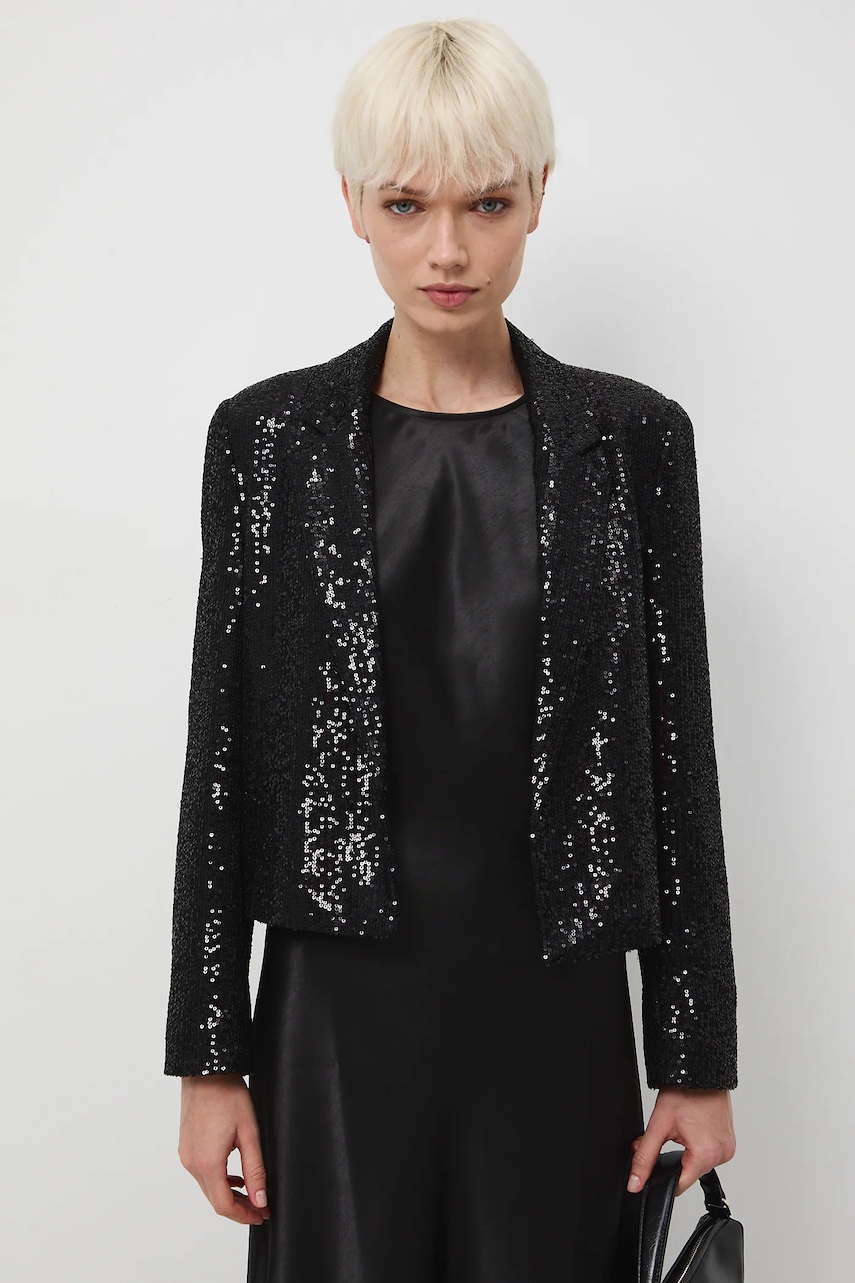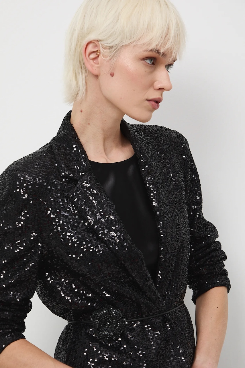 - Fason regular. - Długi rękaw. - W ramiona wszyte poduszki. - Klasyczne klapy. - Niezapinany model. - Model na podszewce. - Model z materiału z cekinami. - Długość: 55 cm. - Długość rękawa: 61 cm. - Szerokość w biuście: 48 cm. - Szerokość w barkach: 40 cm. - Wymiary podane dla rozmiaru: S. - Pasek widoczny na zdjęciu nie jest dołączony do produktu.