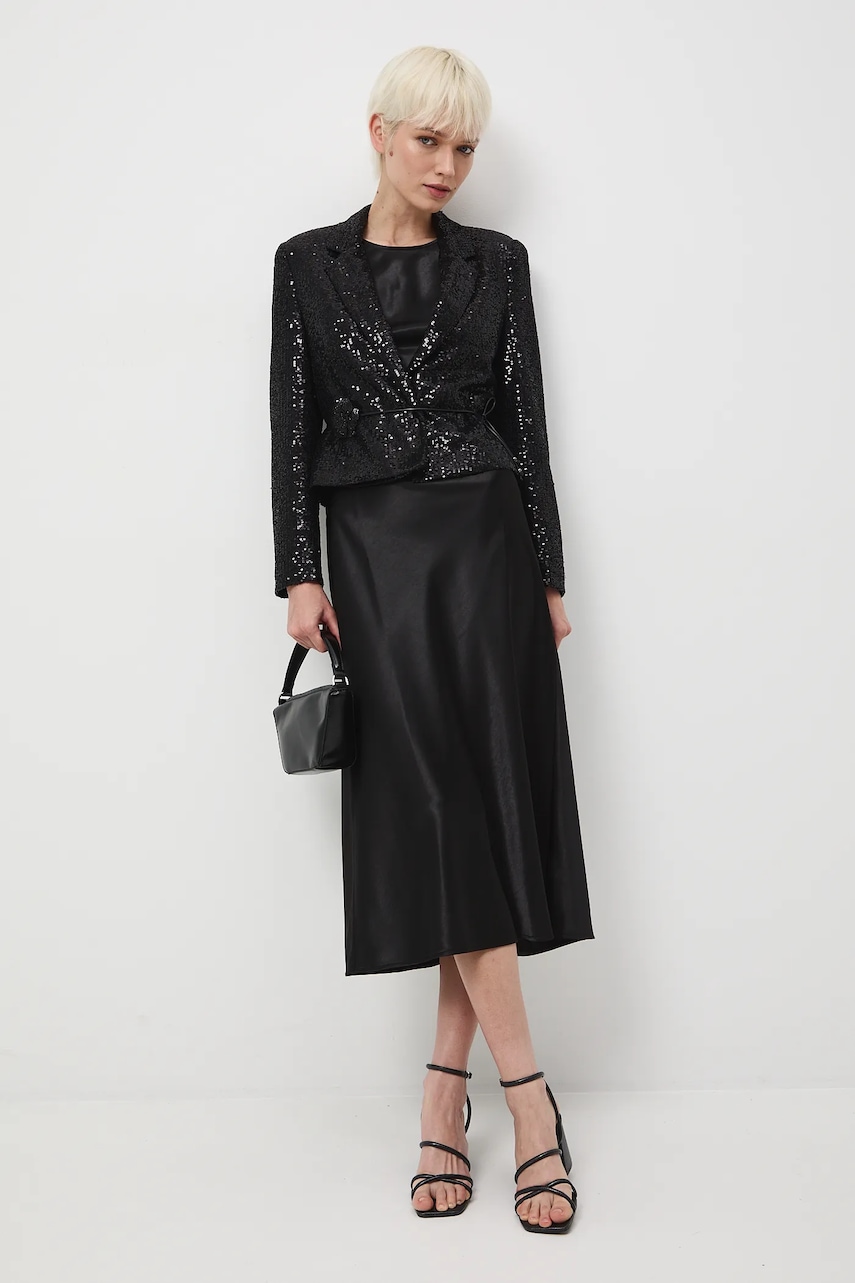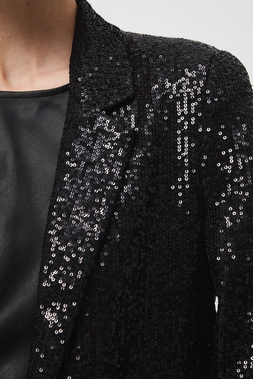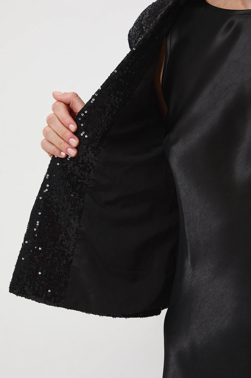 - Fason regular. - Długi rękaw. - W ramiona wszyte poduszki. - Klasyczne klapy. - Niezapinany model. - Model na podszewce. - Model z materiału z cekinami. - Długość: 55 cm. - Długość rękawa: 61 cm. - Szerokość w biuście: 48 cm. - Szerokość w barkach: 40 cm. - Wymiary podane dla rozmiaru: S. - Pasek widoczny na zdjęciu nie jest dołączony do produktu.