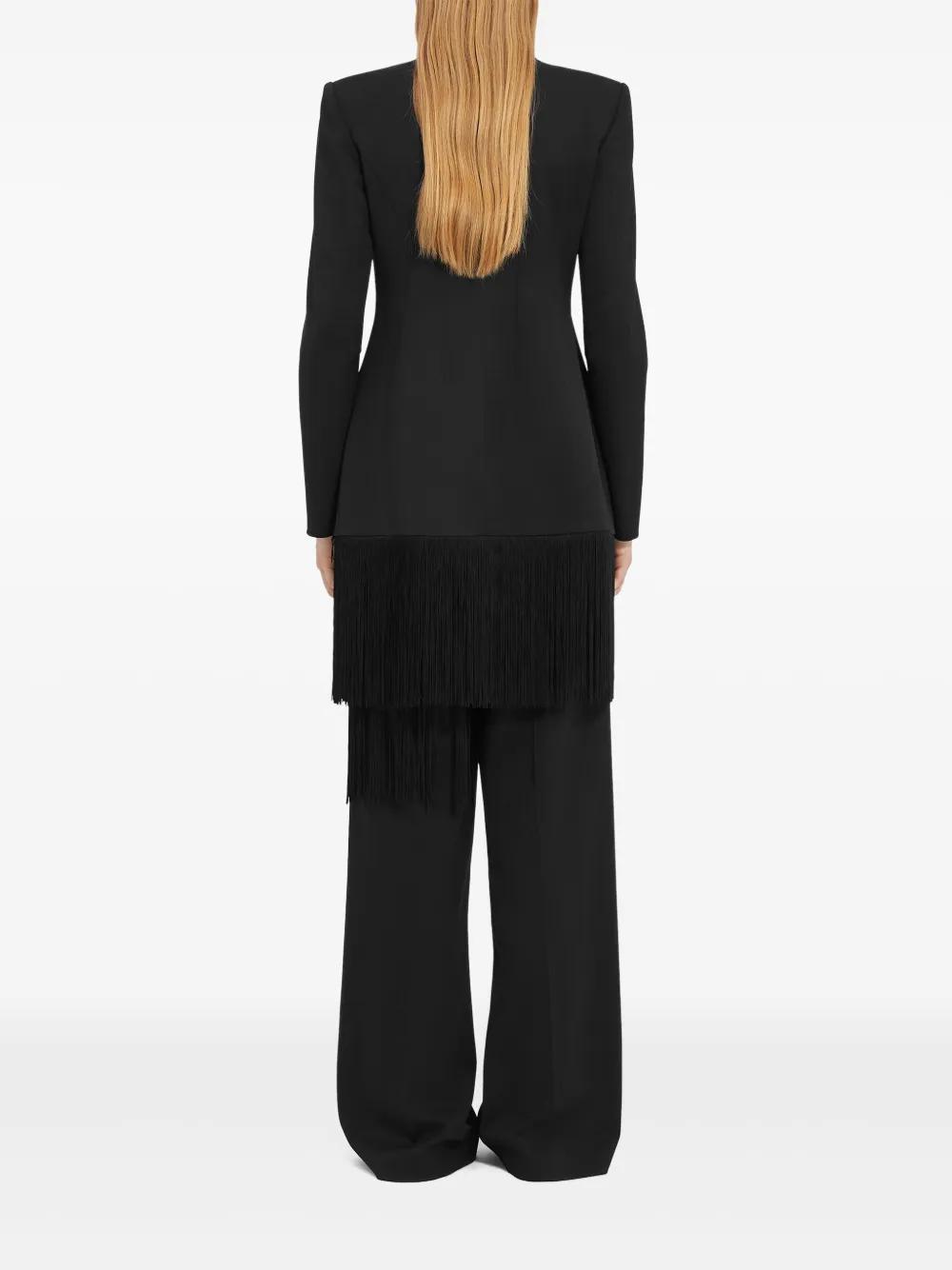black concealed front fastening two front flap pockets shoulder pads shawl lapels