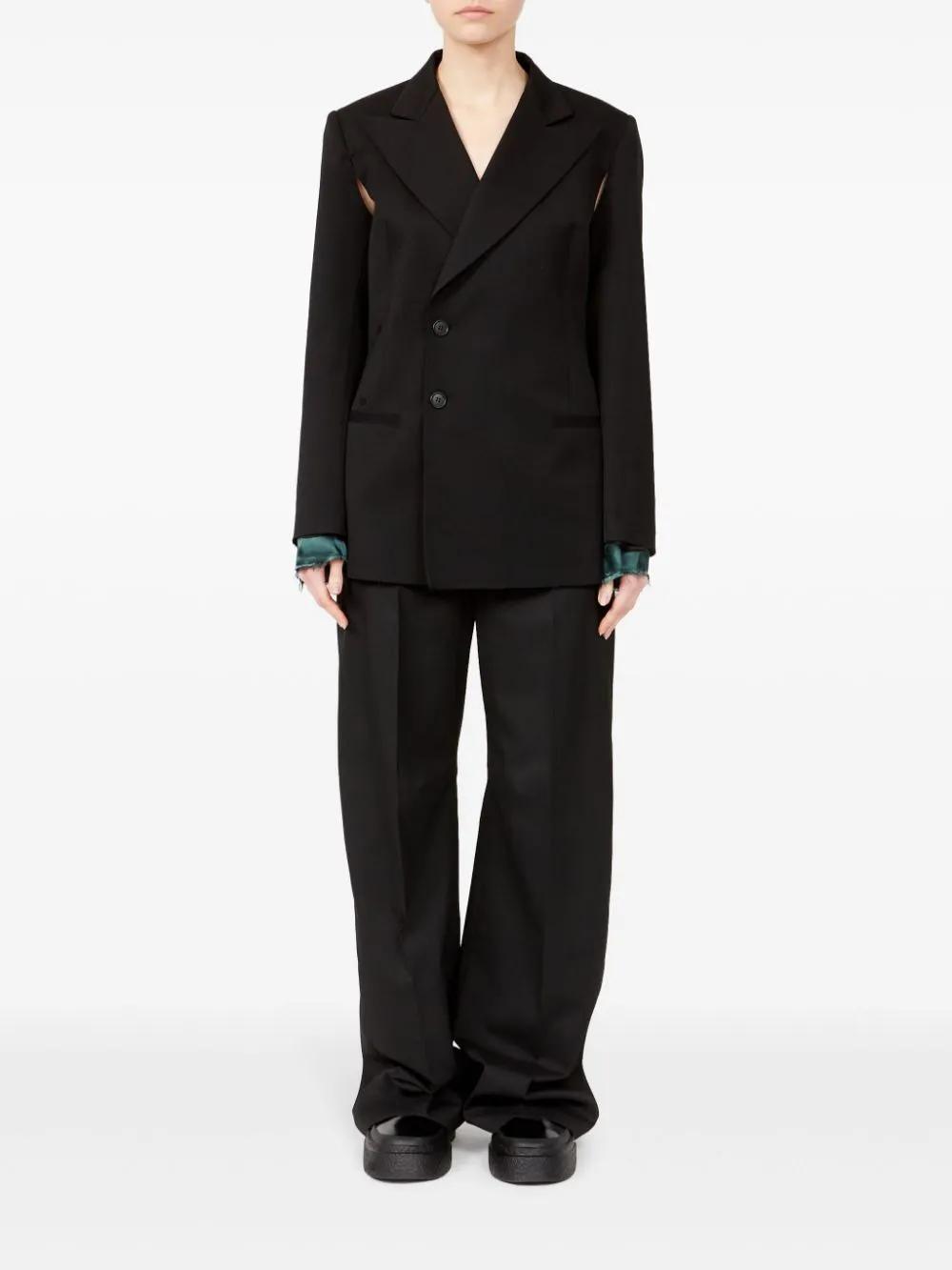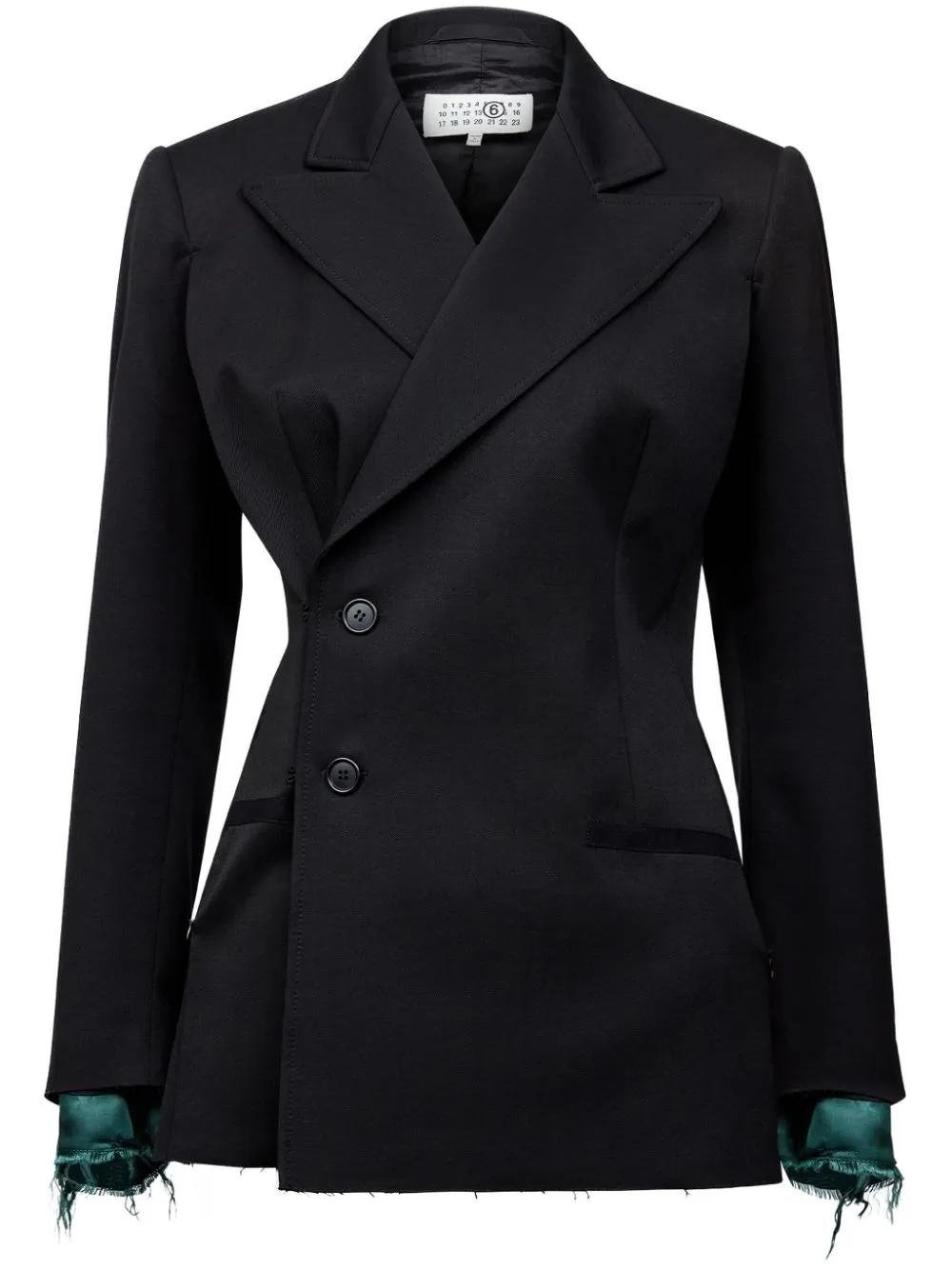 black twill weave dart detailing raw-cut finish wide peak lapels off-centre front button fastening two front welt pockets long sleeves straight hem