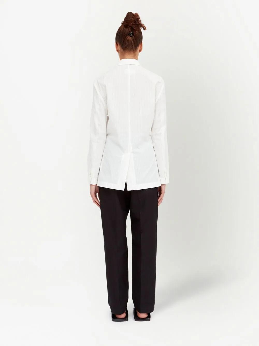 white/black cotton pinstripe pattern notched lapels double-breasted button fastening long sleeves two side flap pockets straight hem