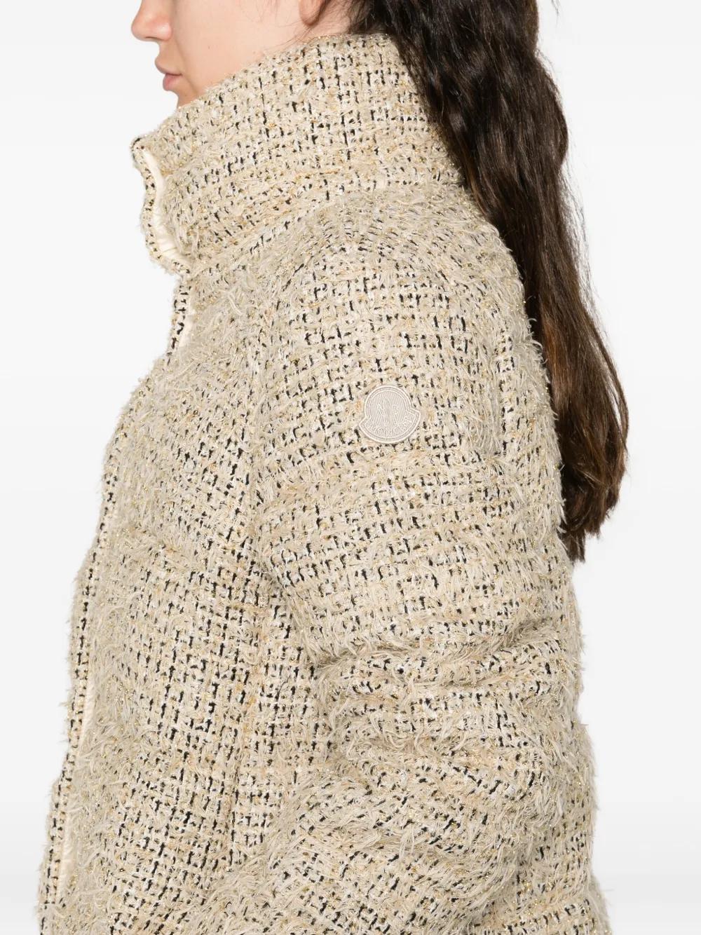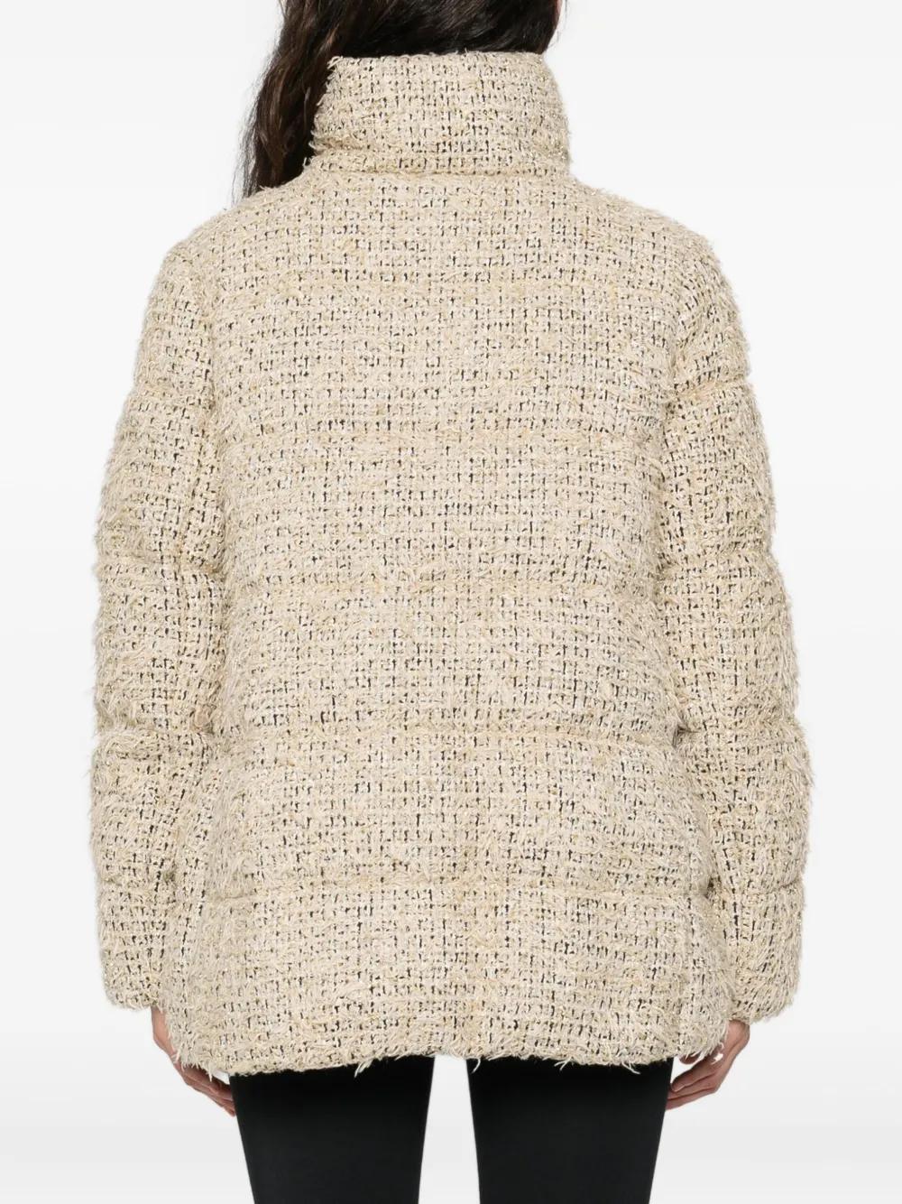 light beige textured weave high neck concealed front fastening long sleeves straight hem