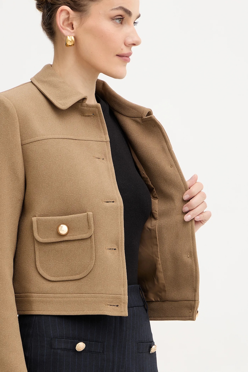 - Produkt zawiera materiały z włókien pochodzących z recyklingu. - Prosty, nie blokujący ruchów fason. - Model z kołnierzykiem. - Zapięcie na guziki. - Z przodu dwie wsuwane kieszenie. - Model na podszewce. - W ramiona wszyte poduszki. - Długość rękawa: 58 cm. - Długość: 49 cm. - Szerokość pod pachami: 45 cm. - Szerokość w ramionach: 50 cm. - Wymiary podane dla rozmiaru: 36.