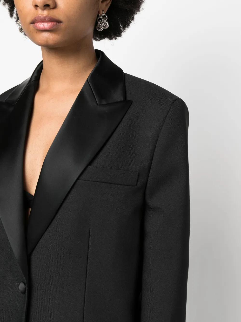 black satin trim wide peak lapels front button fastening dart detailing chest welt pocket two front jetted pockets long sleeves straight hem