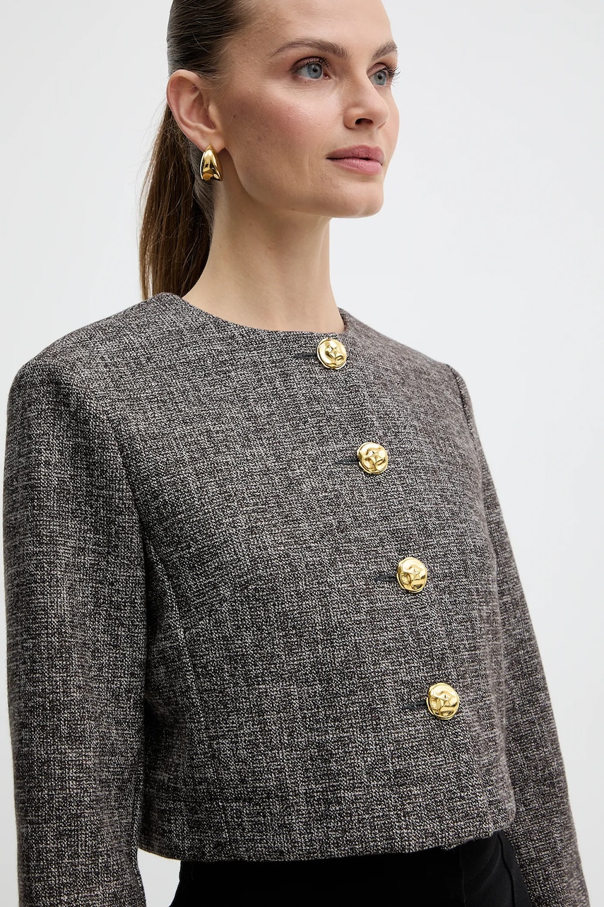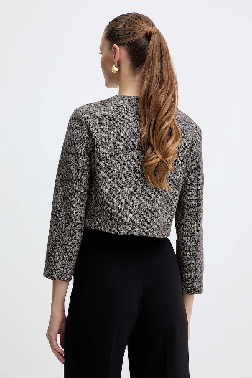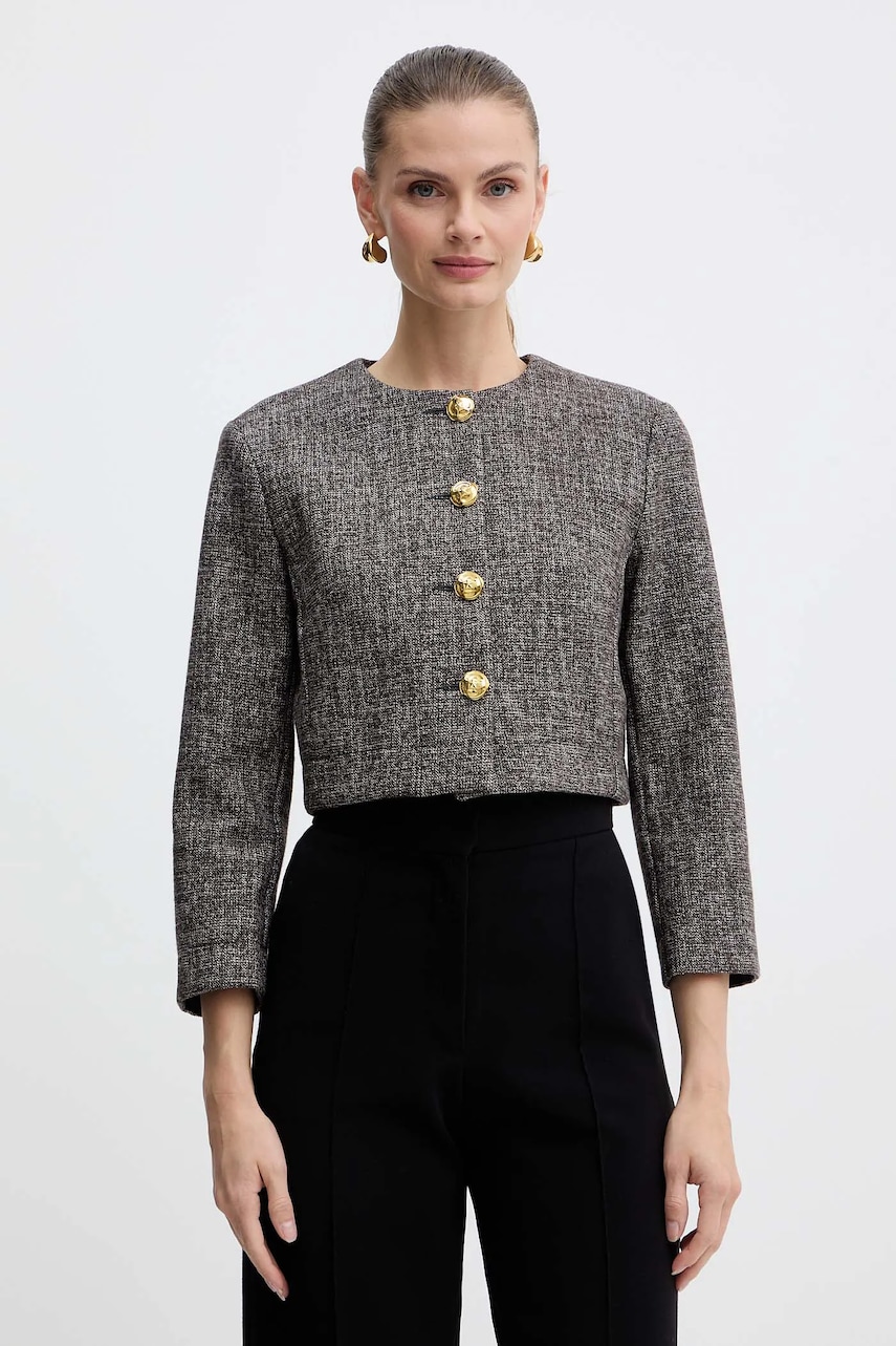 Uwaga: oryginalna rozmiarówka produktów tej marki jest rozmiarówką włoską. Informujemy, że rozmiary na metkach mogą różnić się od zamawianych ze względu na zastosowany przelicznik. - Dopasowany, podkreślający sylwetkę fason. - Model na podszewce. - Jednorzędowe zapięcie na guziki. - Cienki, nieelastyczny materiał. - Długość rękawa: 50 cm. - Długość: 40 cm. - Szerokość pod pachami: 47 cm. - Szerokość w ramionach: 38 cm. - Wymiary podane dla rozmiaru: 36.