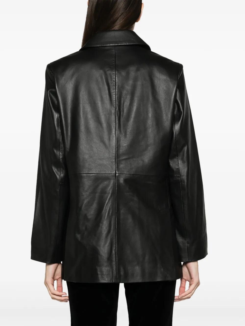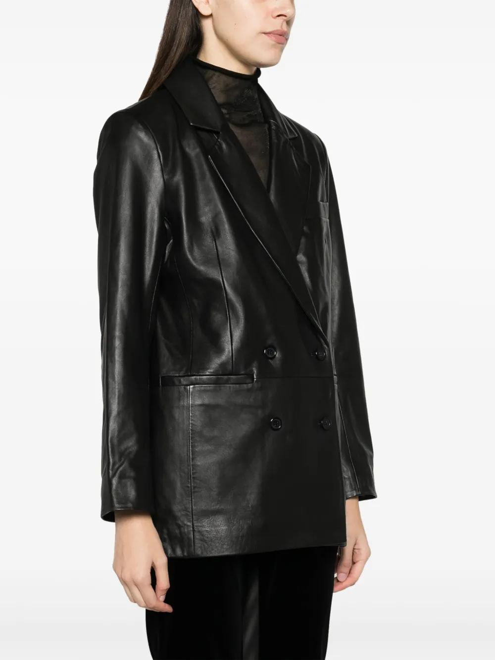 black lambskin grained texture short side slits notched lapels double-breasted button fastening long sleeves chest welt pocket two front jetted pockets English rear vents straight hem full lining