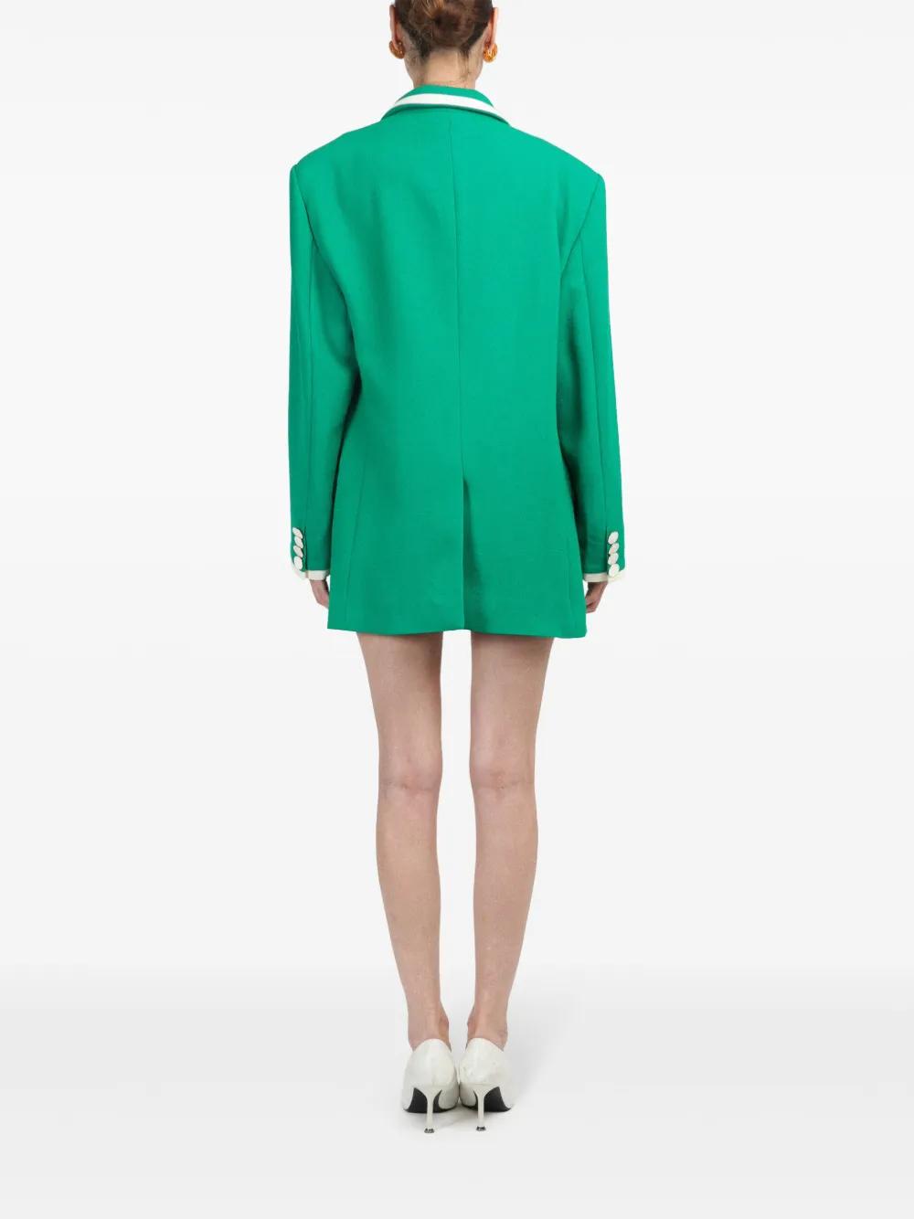 mint green wool front button fastening contrasting trim notched lapels shoulder pads long sleeves buttoned cuffs two side flap pockets central rear vent
