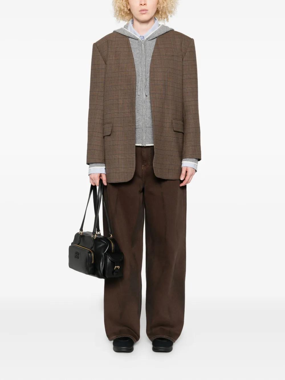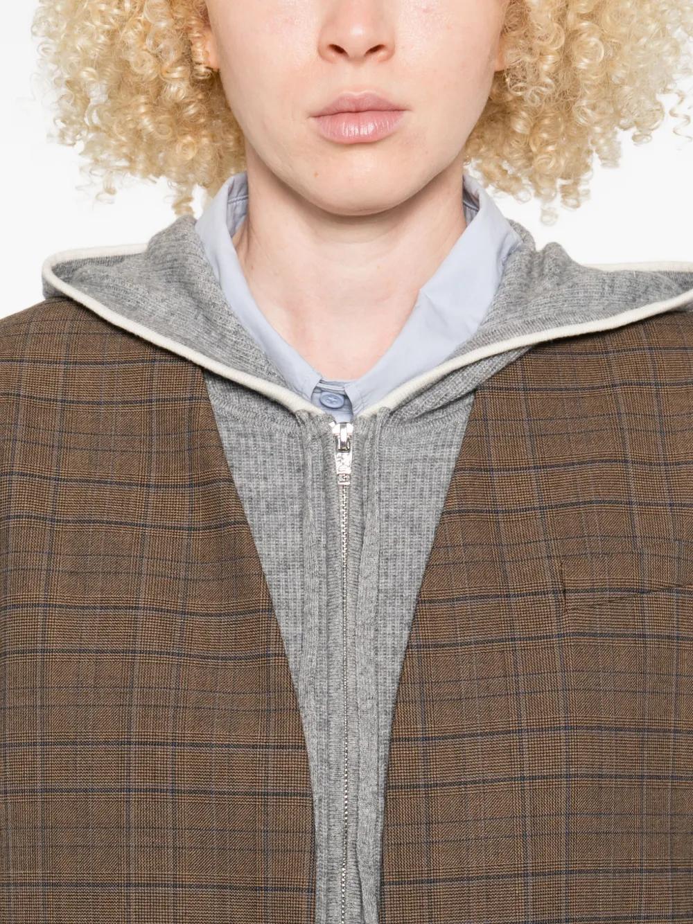 brown checked pattern collarless welt flap-pockets long sleeves
