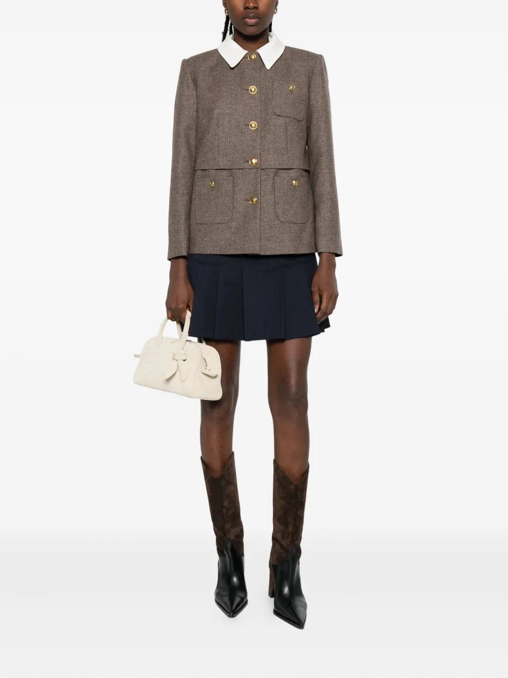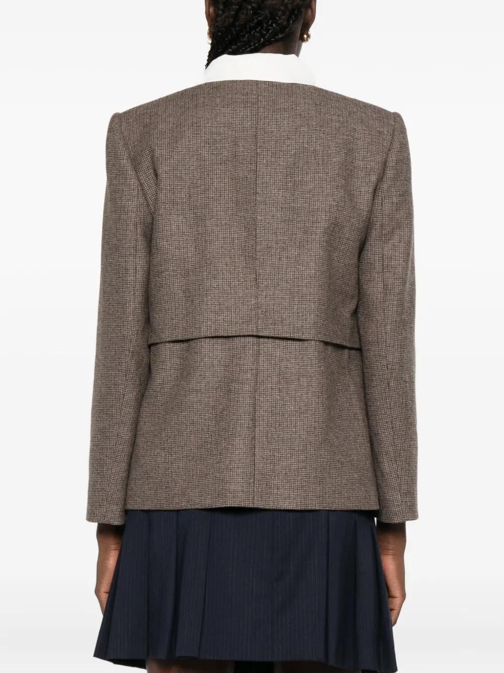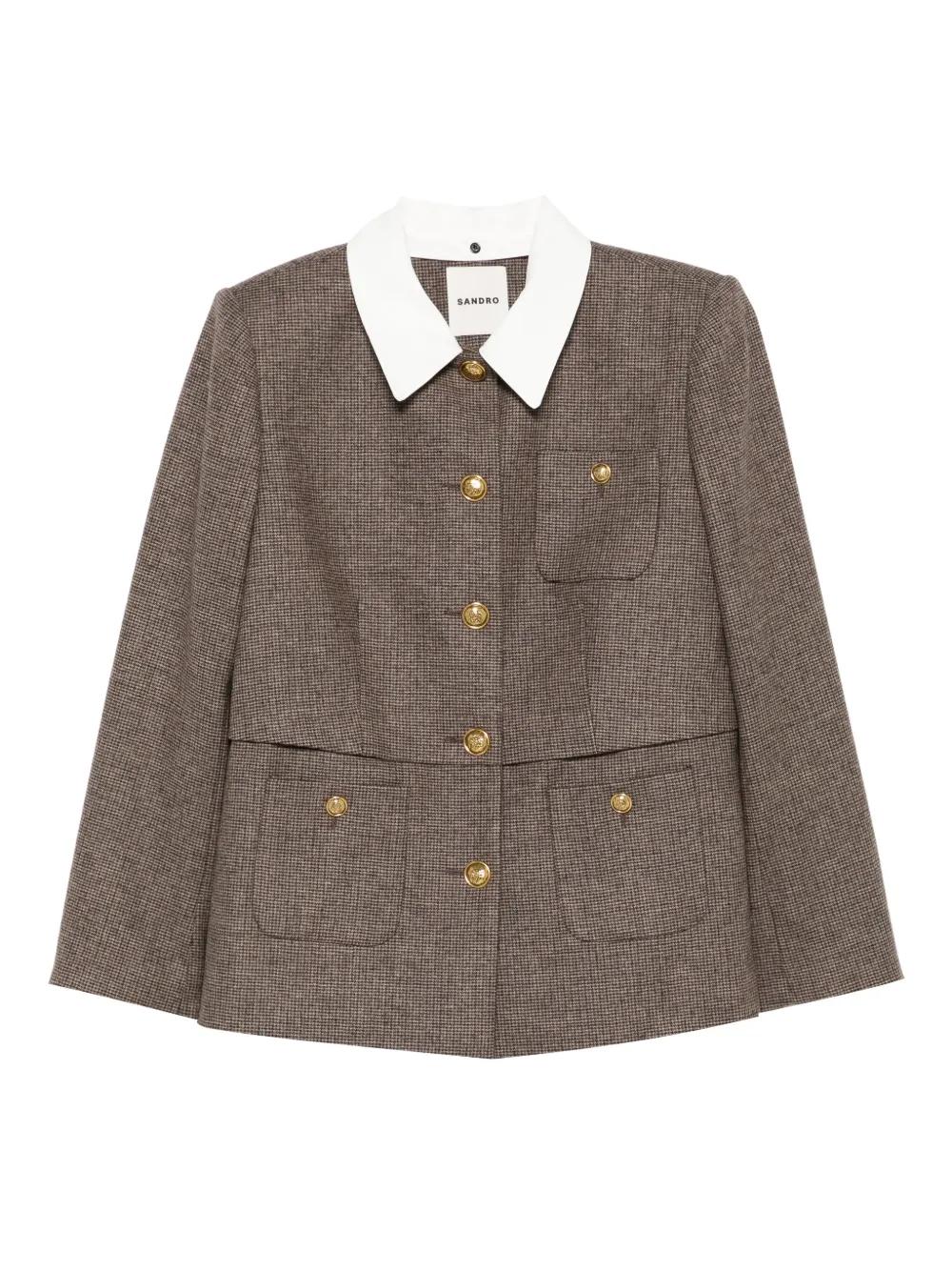 brown houndstooth pattern detachable contrasting collar buttoned pockets button fastening long sleeves