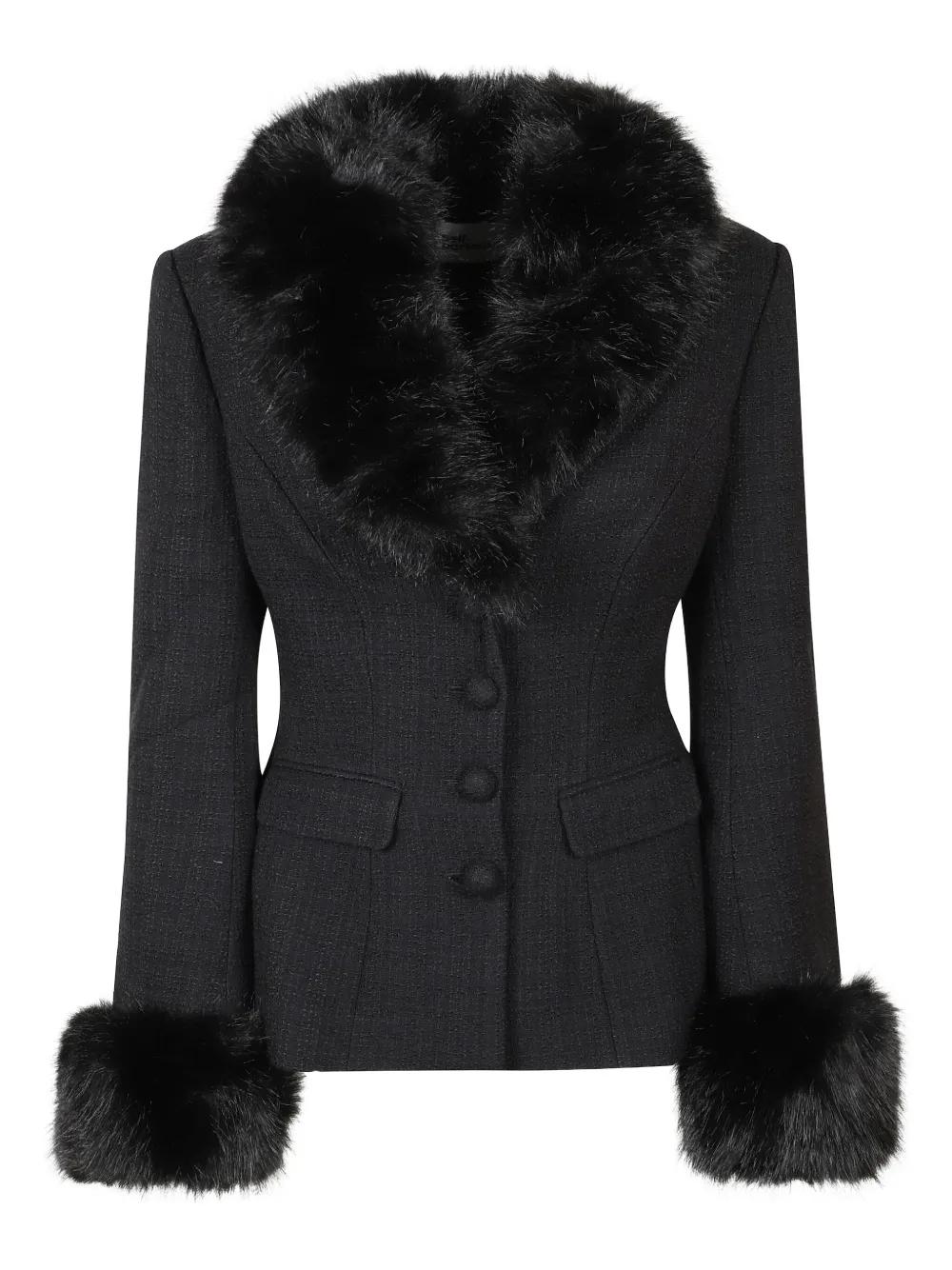 black tweed texture faux fur collar faux fur cuffs button fastening